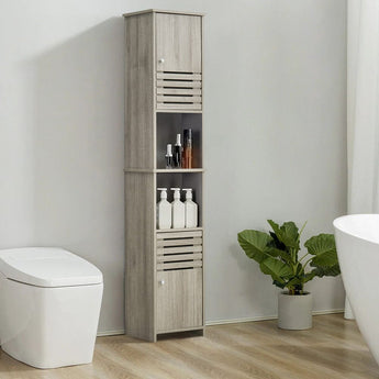 This tall cabinet has a modern and stylish design, which is sure to make a big impression on your bathroom. The strong engineered wood construction makes it sturdy and stable. It features two doors and has two handy open storage compartments in the center. This floor-standing cabinet has a slick grey oak finish, which makes it easy to clean with a damp cloth and would be an excellent storage solution for all your bathroom items.