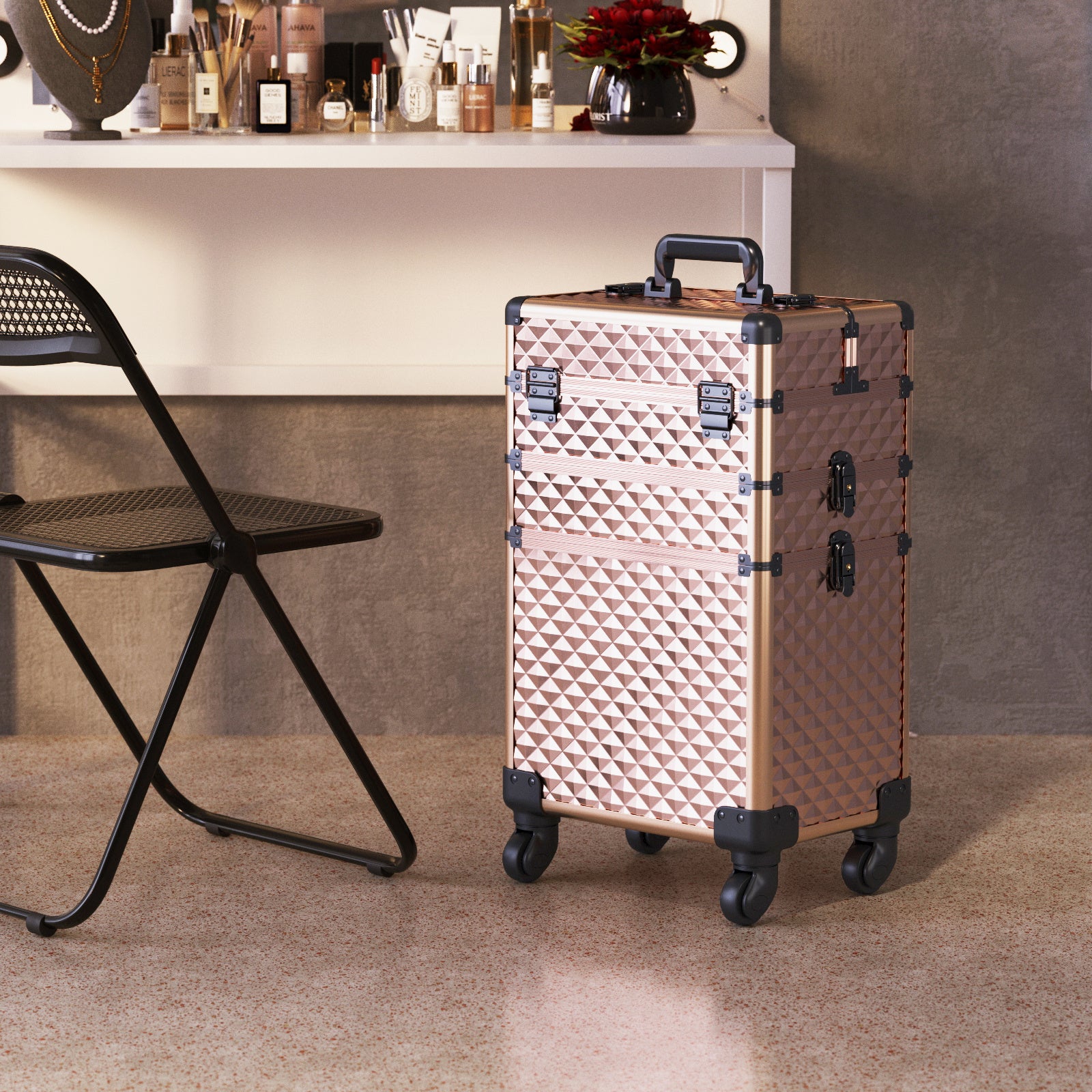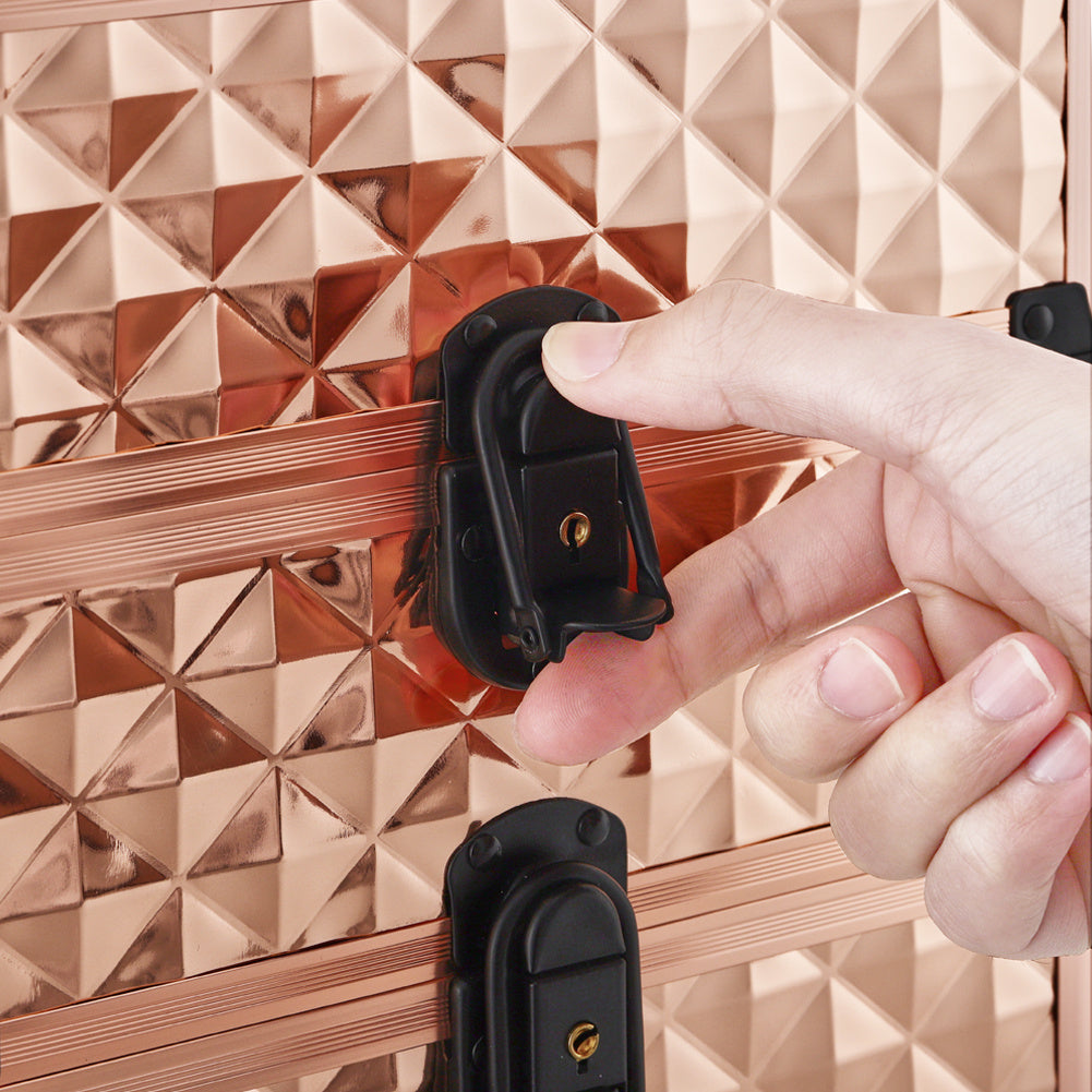 This portable cosmetic case has a stylish and sophisticated design with rhombus cutouts. It is ideal for organizing a wide range of beauty tools, with a top makeup compartment that includes a convenient handle for standalone use. The case also features multiple compartments, including adjustable ones, for storing smaller makeup and accessories, as well as larger tools like hair straighteners and hair dryers. Whether you're a hairstylist, manicurist, or makeup artist, this makeup case is a reliable and professional work companion.