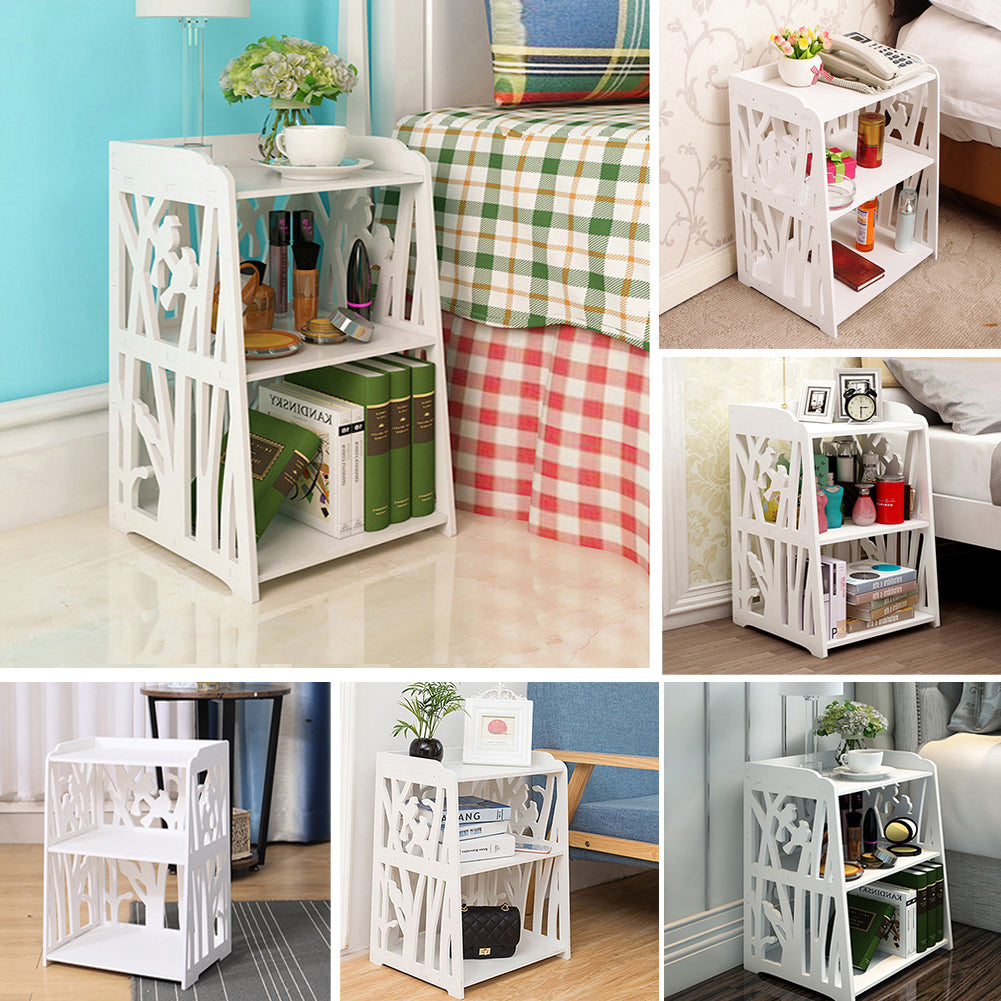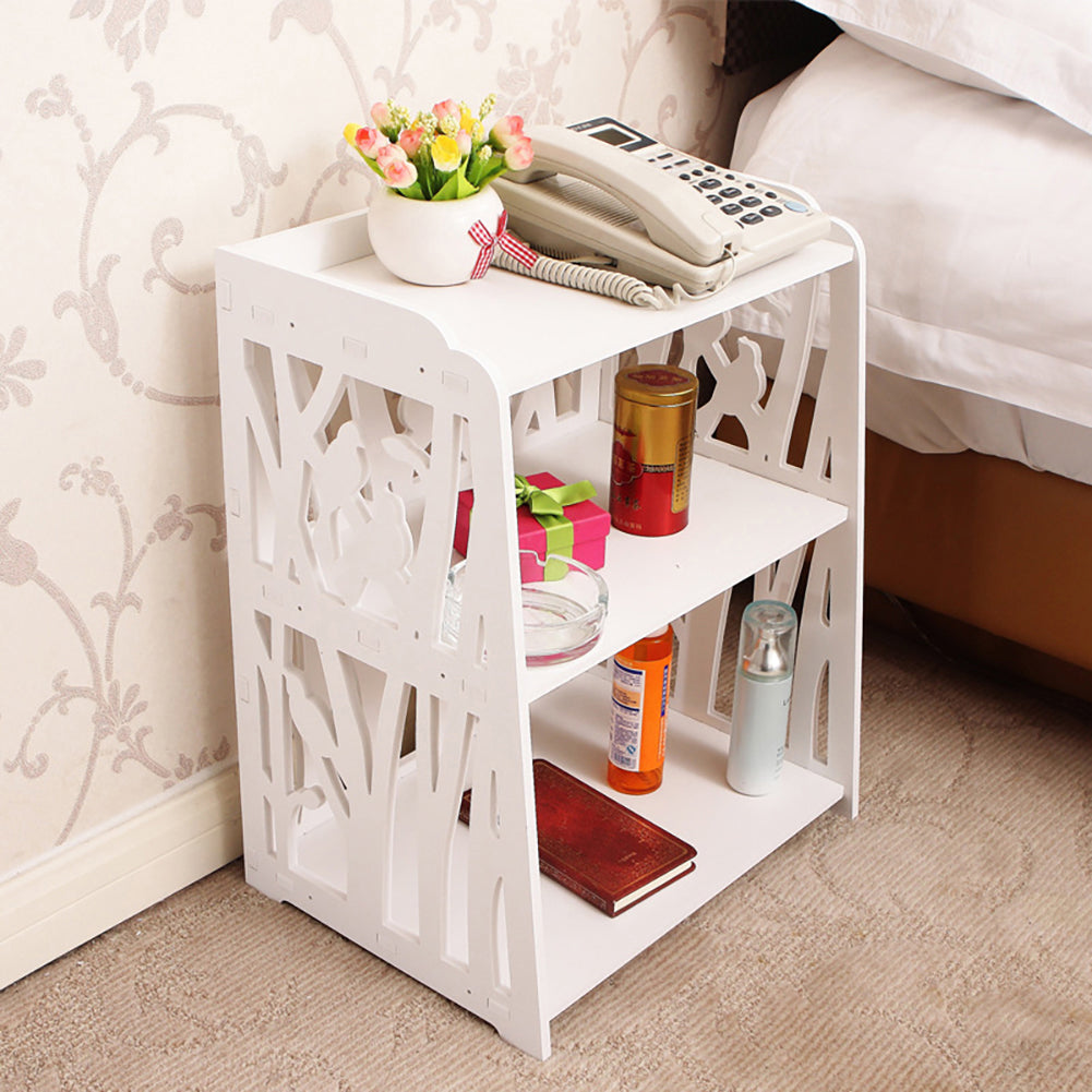 White Bird Pattern Rustic Bedside Table 3 Shelves Wooden