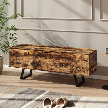 Add rustic charm and practical storage to your space with this industrial storage bench. Made from sturdy wood with a distressed finish, this bench features a hinged lid that opens to reveal a spacious storage compartment perfect for storing blankets, pillows, or other household items. The bench is supported by two angled metal legs with a black finish that provide stability and a stylish contrast to the natural wood.