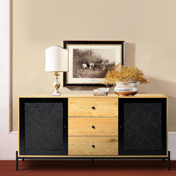 155CM Wide Rattan Wooden Storage Cabinet with 2 Cupboard Doors and 3 Drawers