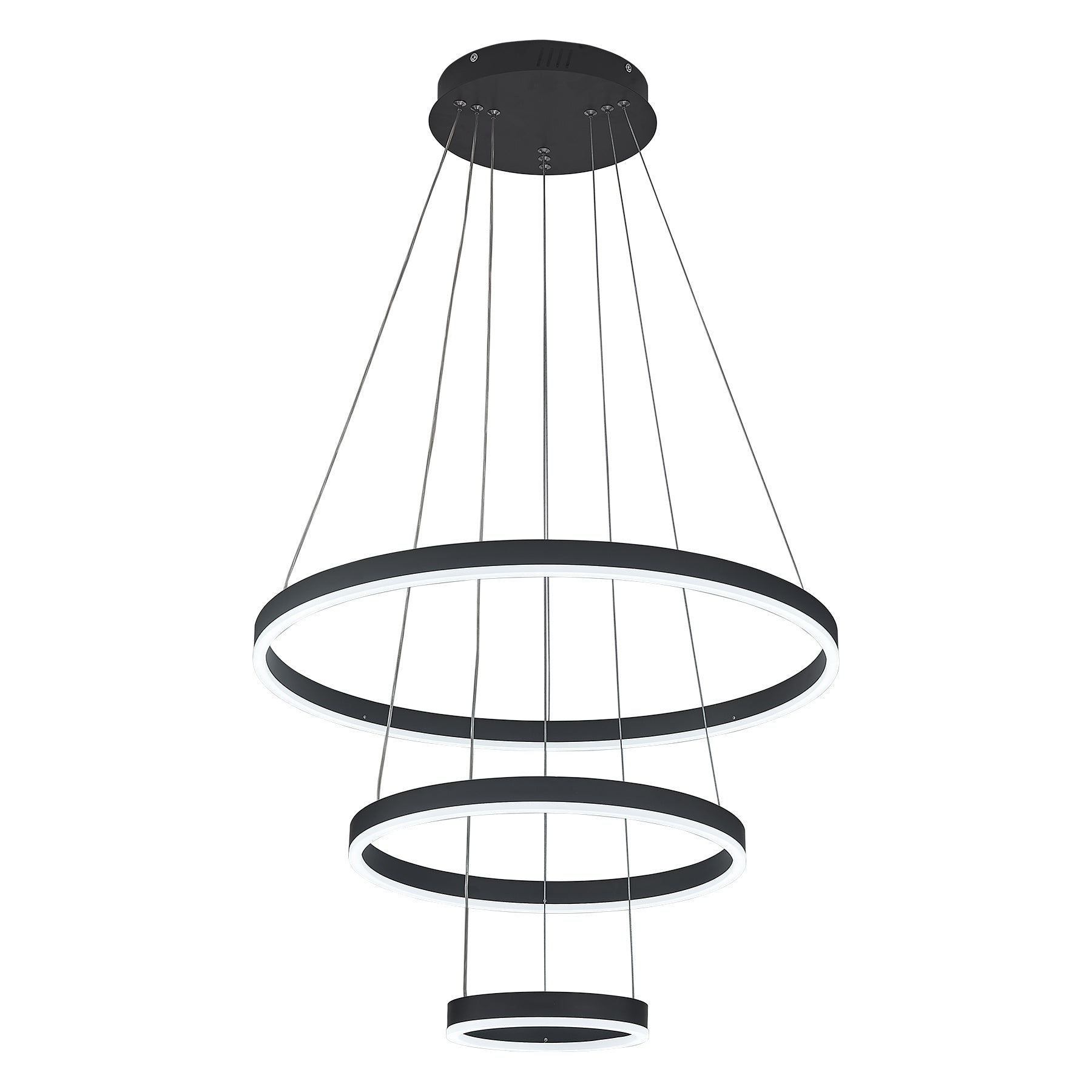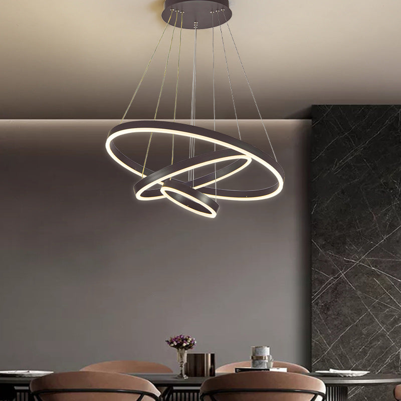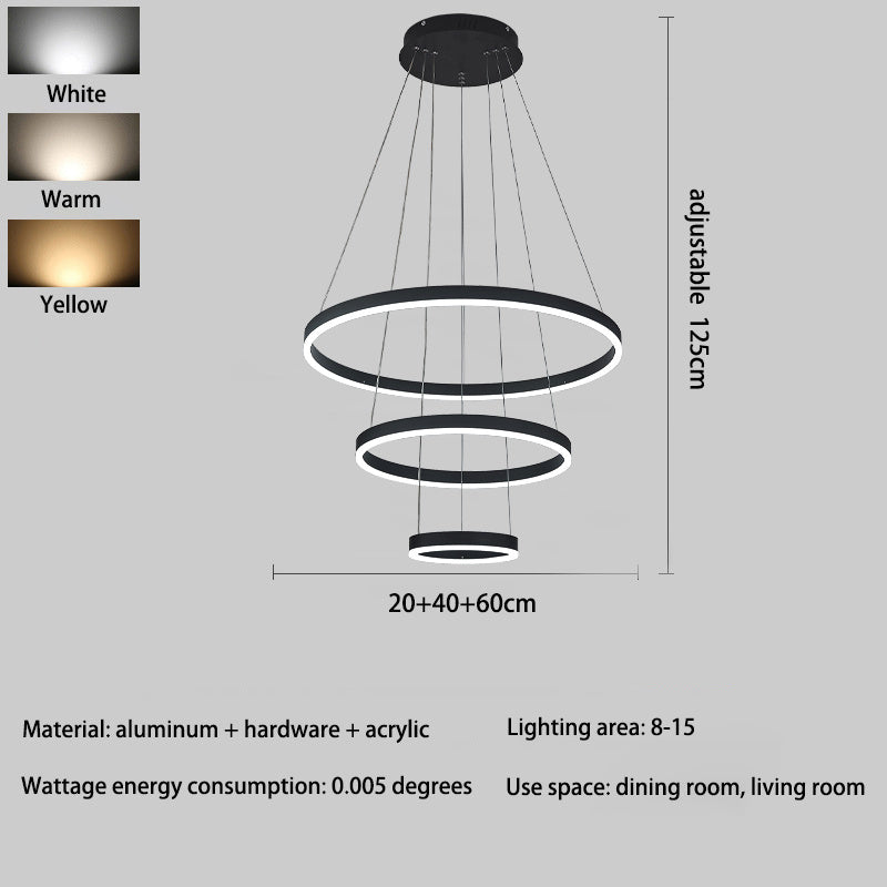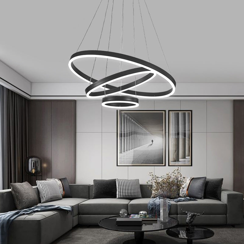 Made of acrylic and metal with a black finish, this simple style pendant light features 3 different sized rings to add light to your space.It emits a bright, non-blinding white light that will effortlessly illuminate your living room, bedroom and kitchen.This pendant light is both flexible and practical. With the adjustable cord, you are able to adjust the height of the light fixture to your ceiling and it can be made into different shapes for an impressive look.