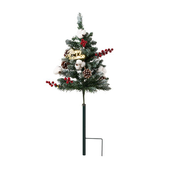 Brighten your outdoor spaces with this charming solar-powered Christmas tree decoration, designed for effortless festive charm. Its lifelike branches are layered to create a full silhouette, finished with a delicate snow dusting for a fresh winter look. Adorned with red berries, white cotton balls, and brown pine cones, each tree also features a golden blessing accent for traditional seasonal style. The included LED string light, which is powered by a solar panel, automatically glows at dusk to create a soft ambient sparkle across gardens, pathways, or porches. Sold as a set of four, these versatile trees can be arranged in a line to create a welcoming outdoor scene.