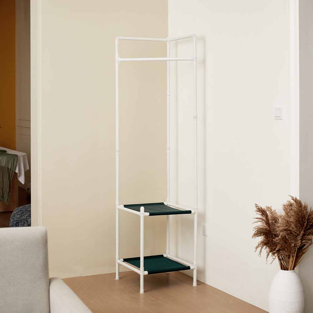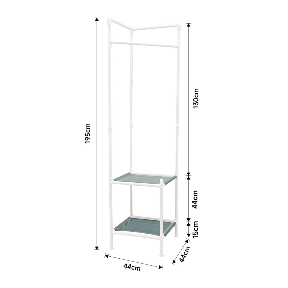 Optimize the layout of your room with this space-saving Corner Clothing Rack . Crafted with a robust white PP tube structure and fitted with green non-woven shelves, this rack is as functional as it is visually appealing. The corner design maximizes the use of the nooks in your room, making it ideal for apartments or rooms with limited space. Assembly is a breeze with its user-friendly design, no tools are required.