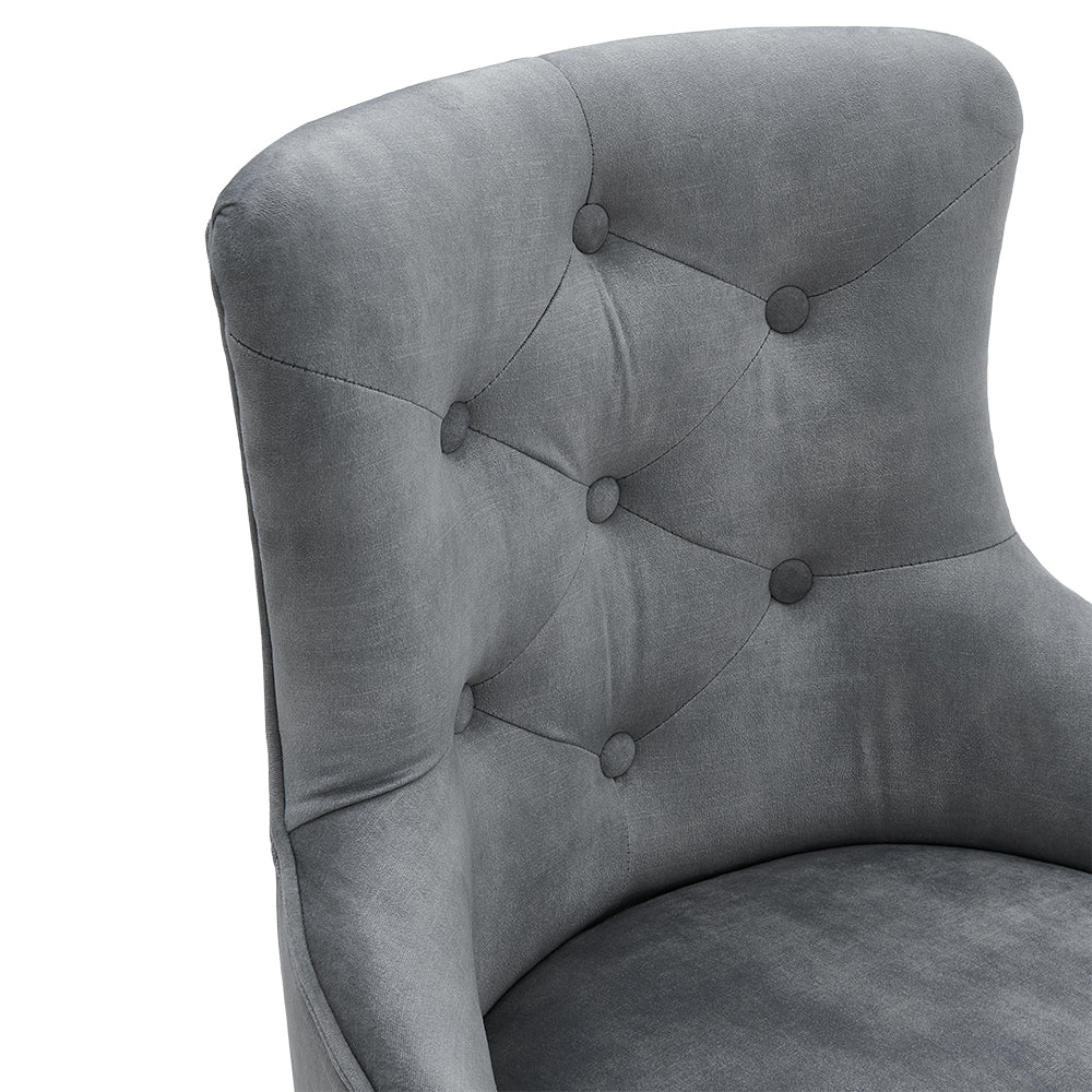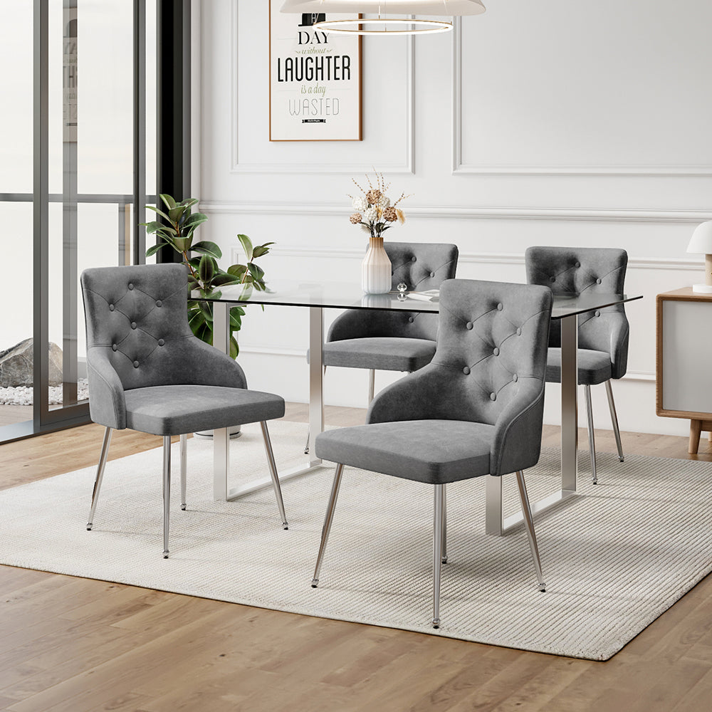 Crafted with high-quality materials, this dining chair guarantees long-lasting use. The velvet fabric, supported by a sturdy wood frame, offers maximum durability. The padded seat and back, filled with high-density foam, provide unparalleled comfort. With its modern grey upholstery and sleek metal legs, this chair is the perfect complement to any dining table.