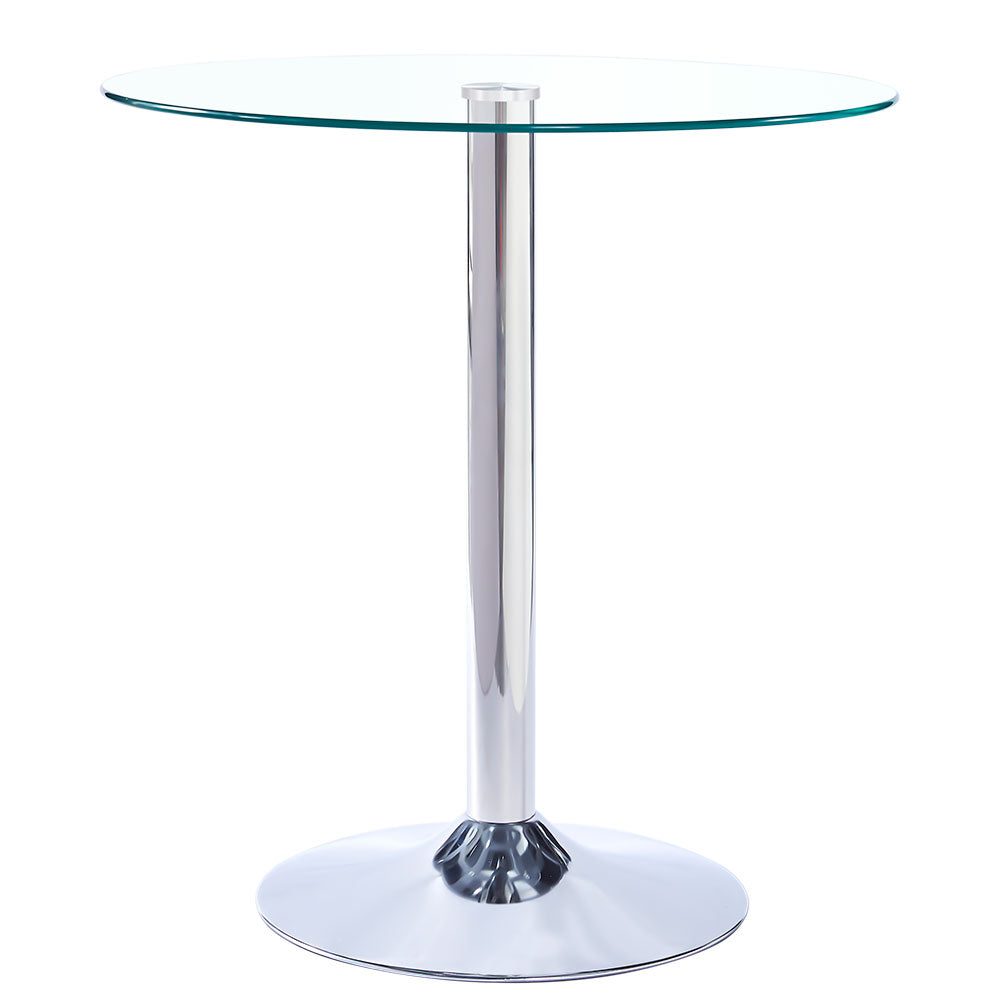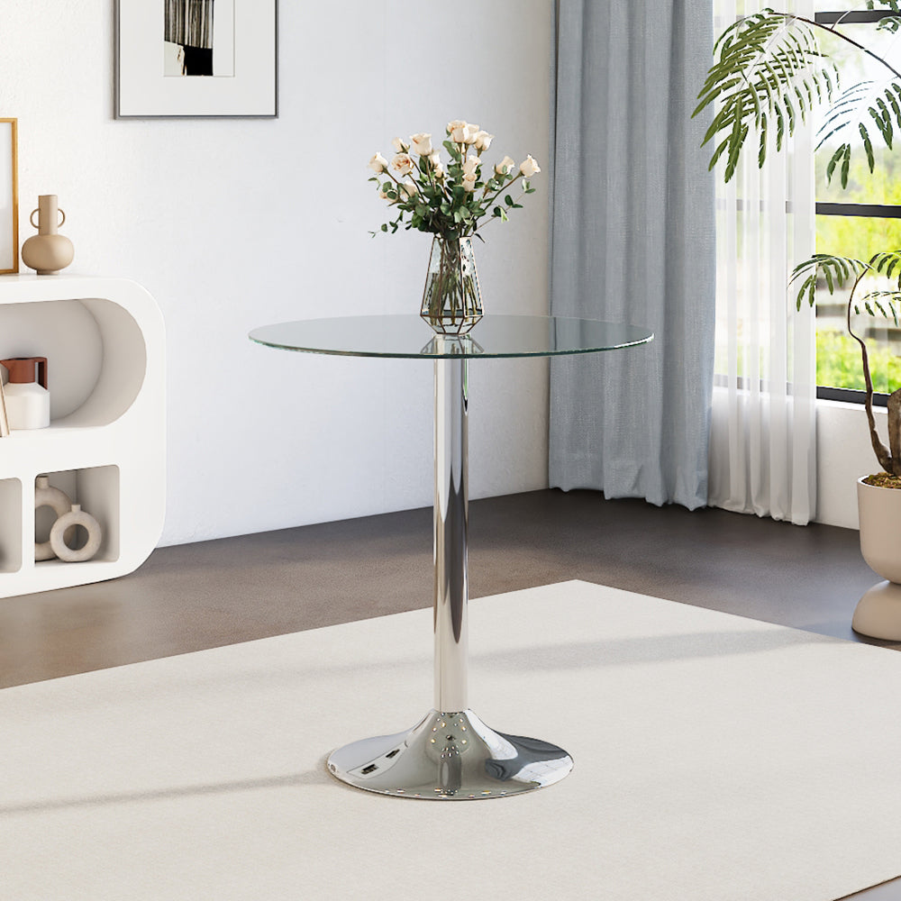 This dining table with a round glass top is an excellent choice for dining rooms with limited space. The shiny chrome base and the clear glass tabletop harmonize beautifully to create a uniquely ultramodern look. It allows you to enjoy an intimate dinner with your loved one in style while elevating your dining space. Supported by a pedestal electroplated base, the table can stand steadily and firmly on the floor. ?