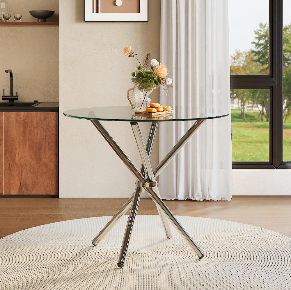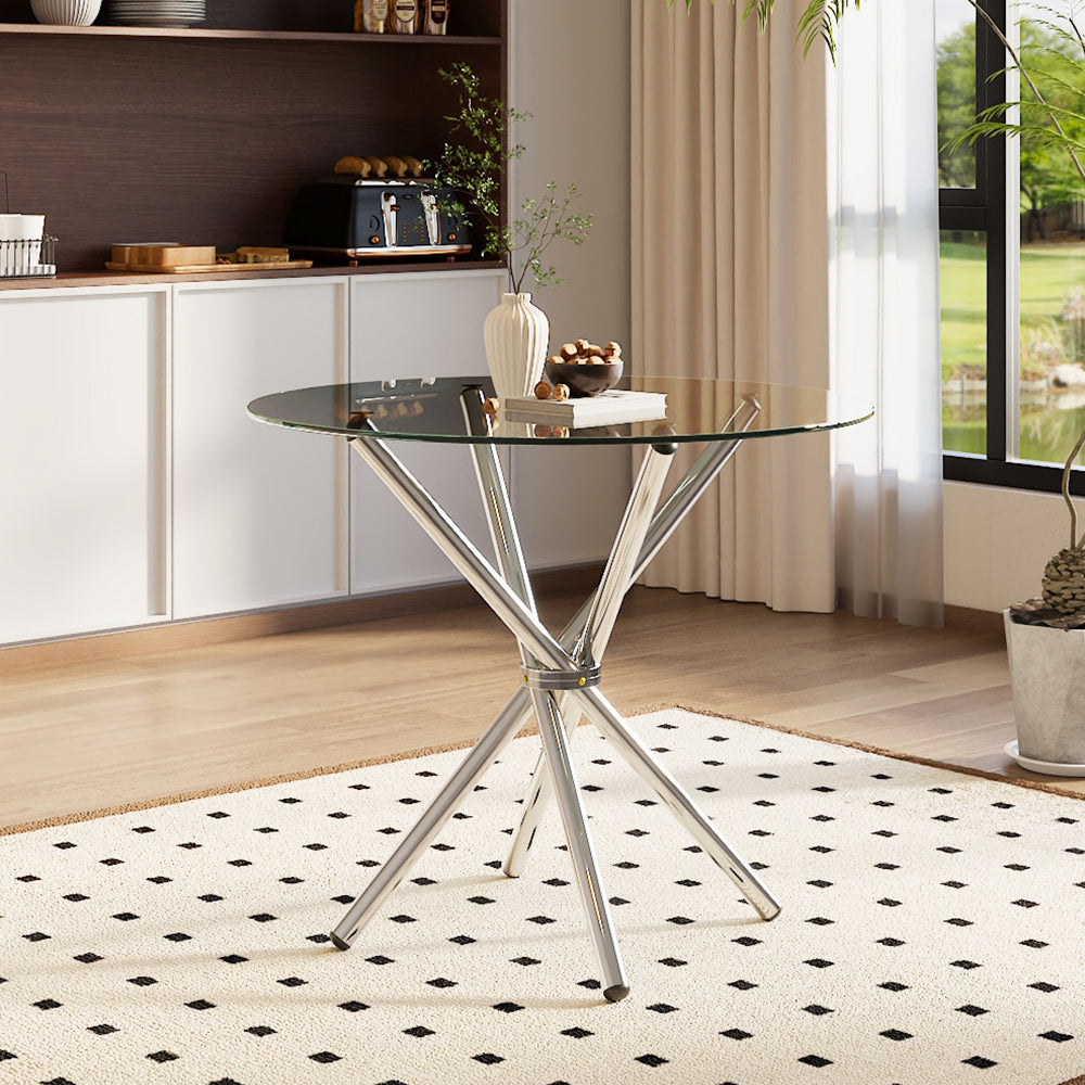 The Tempered Glass Crossover Round Dining Table boasts a sleek steel chrome base, a striking cross-over design, and a durable glass top that allows it to seamlessly blend into any room in your home. Whether utilized as a breakfast nook in the living room, a side table next to your beloved sofa, or as an elegant accent piece, this table is versatile and meets all expectations. Plus, with a seating capacity of 4, it is ideal for those who love to entertain.