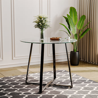 This modern round dining table has a metal base with a unique crossover setting technique and a tempered glass top for durability. The modern style design and simple looking silhouette make it easy to match with any home decor. In addition, the smooth table top makes it easy to wipe clean, suitable for use in a variety of rooms such as dining rooms, living rooms, etc. Sit around the table with friends or family and enjoy your leisure time!