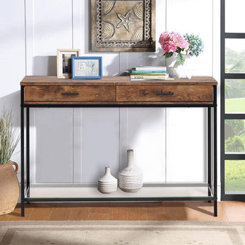Looking for a chic and elegant way to store your belongings This 2 Drawers Console Table is perfect for you! Made of wood and tempered glass, this table is both stylish and functional. The wood table top and bottom glass shelf are wide enough to store your sundries, decorations, photo frames, vases, etc. This console table features a charming rustic design with painted legs, which is born for long service. It comes with two spacious drawers, perfect for storing your essentials, and a convenient glass shelf that can be used to display your favorite decor items. Its proper size makes it perfect for the living room, bedroom, study, kitchen, and hallways to serve as a sofa table or storage shelf.