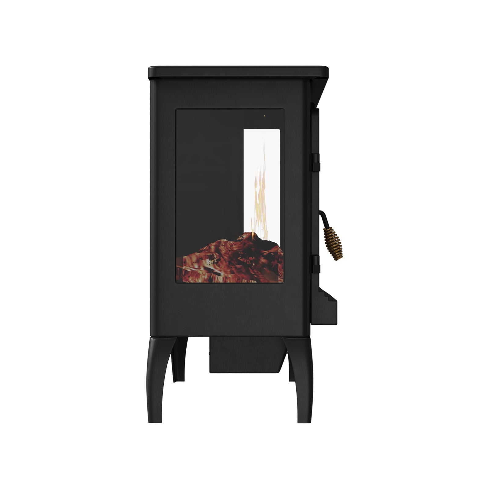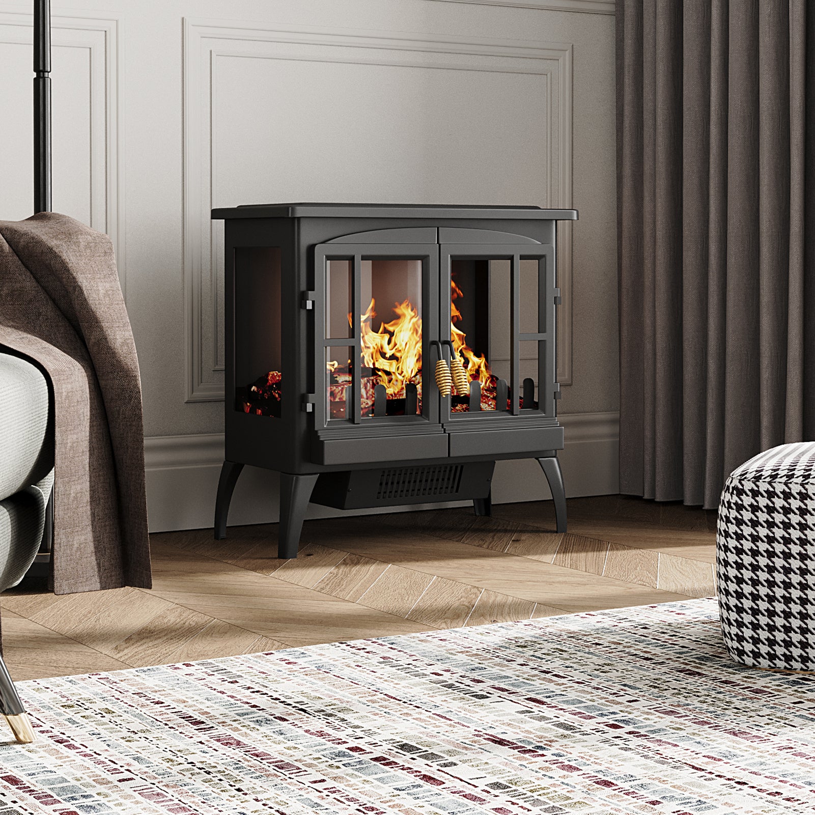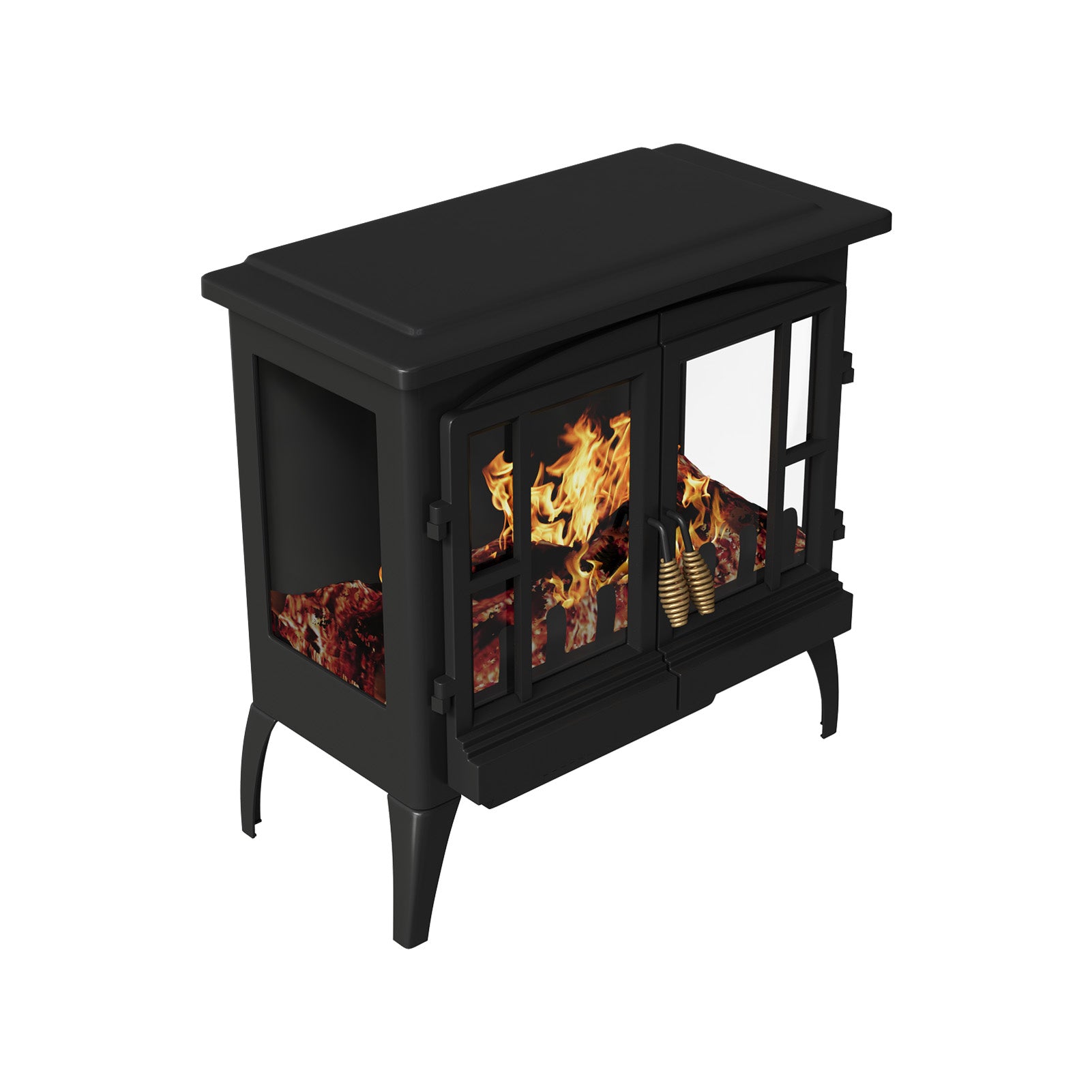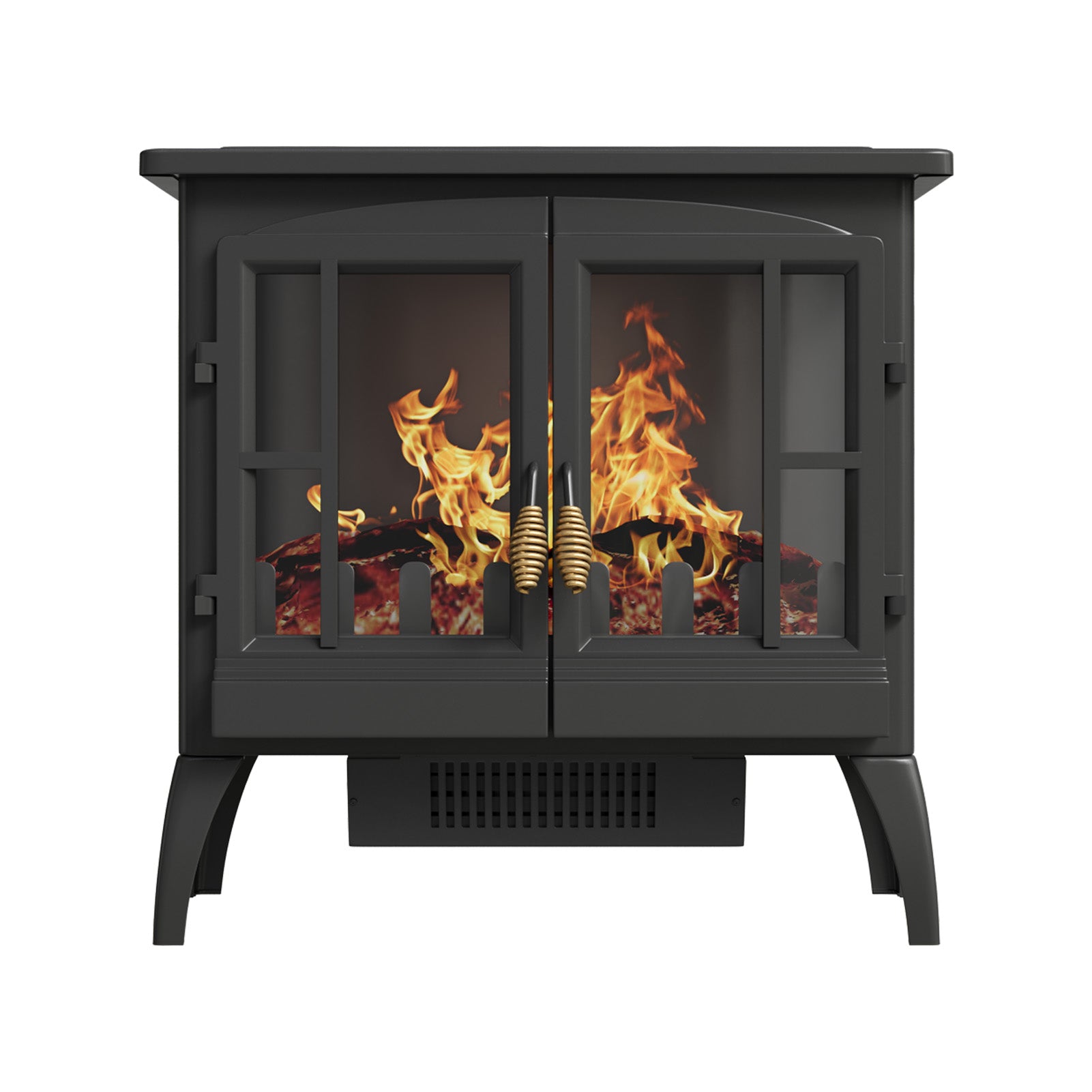 This electric fireplace perfectly combines practicality with aesthetics. It features a classic black finish that exudes an air of high-end sophistication, while the dual-door design offers a panoramic view of the flame effect, enhancing the sense of realism. Utilizing advanced light simulation technology, it produces lifelike flames that can be adjusted for brightness to suit various ambiance needs. It is equipped with four sturdy support legs to ensure safety and stability during use. More than just a heating appliance, it serves as a piece of art that enhances home decor, bringing warmth and comfort to your living space.