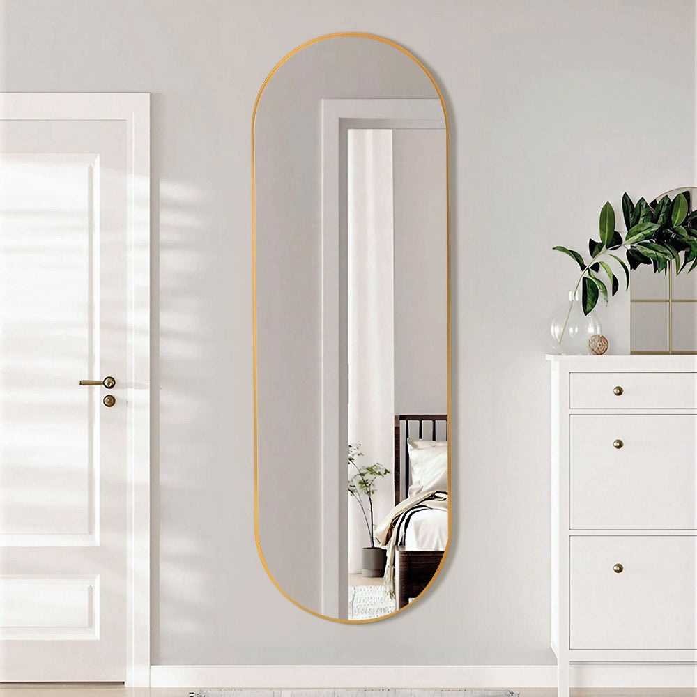With this stunning oval full length mirror , add a touch of glamour to your home. This mirror is fashionable as well as practical, with a sleek sturdy metal frame finished in a luxurious gold finish. Its dimensions of 150 cm in height and 50 cm in width make it the ideal size for examining your entire outfit. Hang it to create a focal point and improve the decor of any area in your home, whether it be the bedroom, dressing room, or hallway.