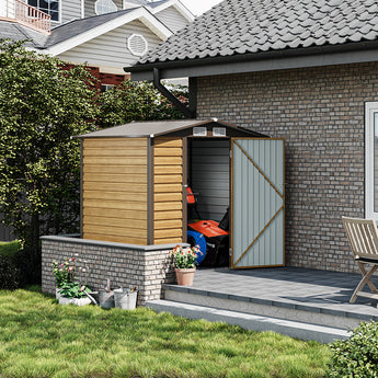 Constructed from durable and stable galvanized steel, this 189.8cm W Outdoor Storage Shed adds an ideal outdoor shelter to your garden. Its natural wooden texture seamlessly blends into your outdoor space, enhancing its rustic appeal. With a lockable door, you can confidently store your garden tools, equipment, and essentials, knowing they will be protected from any outdoor conditions. Additionally, its robust construction can withstand any weather conditions, making it a reliable choice for your storage needs.