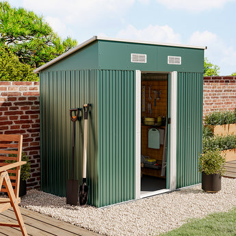 Our garden storage shed is the perfect storage solution for your valuable gardening and outdoor tools. With its spacious interior, it easily accommodates a wide range of items from hammers and wrenches to lawn mowers and ladders. Equipped with two ventilation ports, it ensures proper air circulation inside, preventing heat and moisture buildup, thus offering an optimal preservation environment for your belongings. Additionally, the pent roof design efficiently prevents water and snow accumulation, reducing maintenance costs. Whether used as a garden shed or a utility room, it keeps your tools neatly organised and within easy reach.