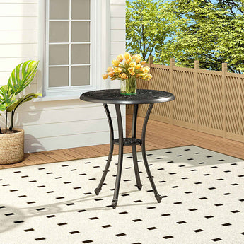 Enhance your outdoor dining space with the Round Patio Dining Table. Made of durable, lightweight cast aluminum with a rustproof black finish, this table has a timeless curved leg design and a decorative desktop. The center features an umbrella hole for use with most standard umbrellas, providing protection from sun or rain. Enjoy the beauty and practicality of this table on your patio or deck.
