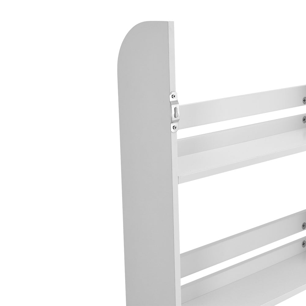 Increase your vertical space while adding a stylish touch to your home with this wall-mounted shelf. Designed with safety in mind, it offers four levels of shelves with baffles to prevent items from falling and causing accidents. Made of sturdy MDF board, it ensures long-lasting and secure use without the worry of damage or deterioration. Whether displaying decorations or storing daily essentials, trust that your belongings are securely organized, protecting pets and children from harm.