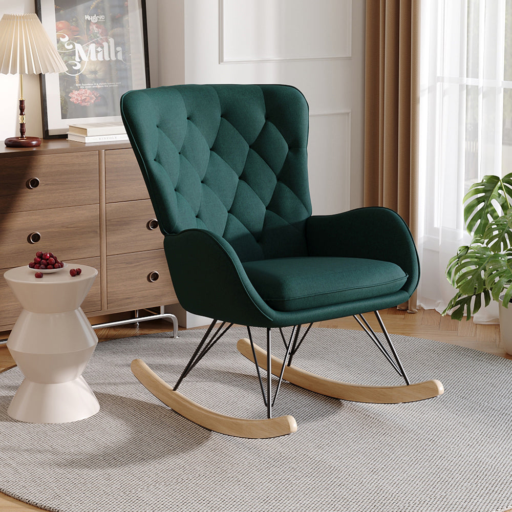 Experience ultimate comfort and relaxation while reading, listening to music, or even taking a nap with the gentle swaying of this chair. The metal frames and wooden runners provide sturdy support for safe and comfortable rocking. The timeless charm of the rhombus detailing on the back makes this chair a perfect addition to any living room or bedroom.