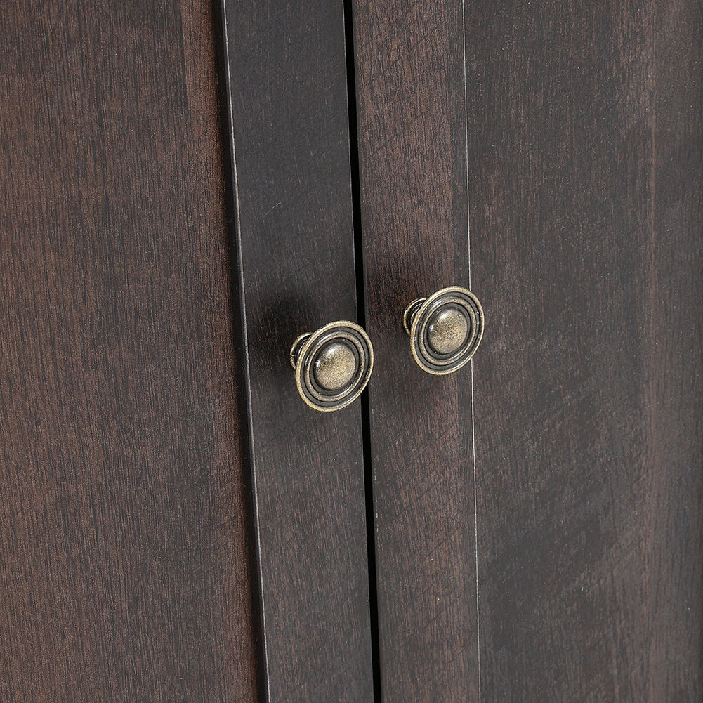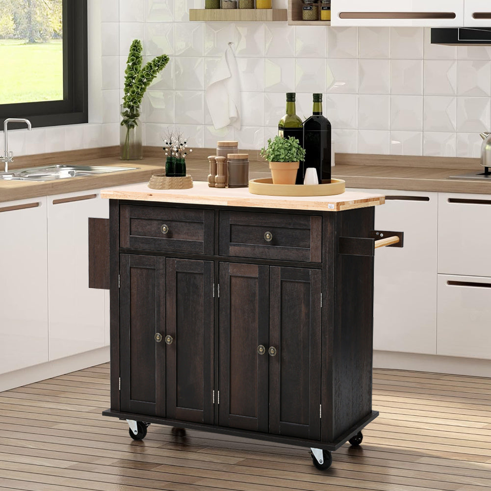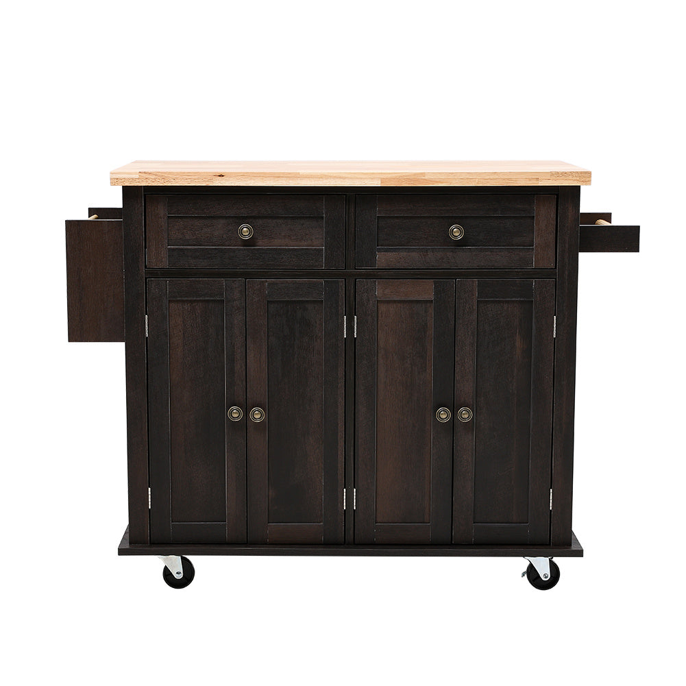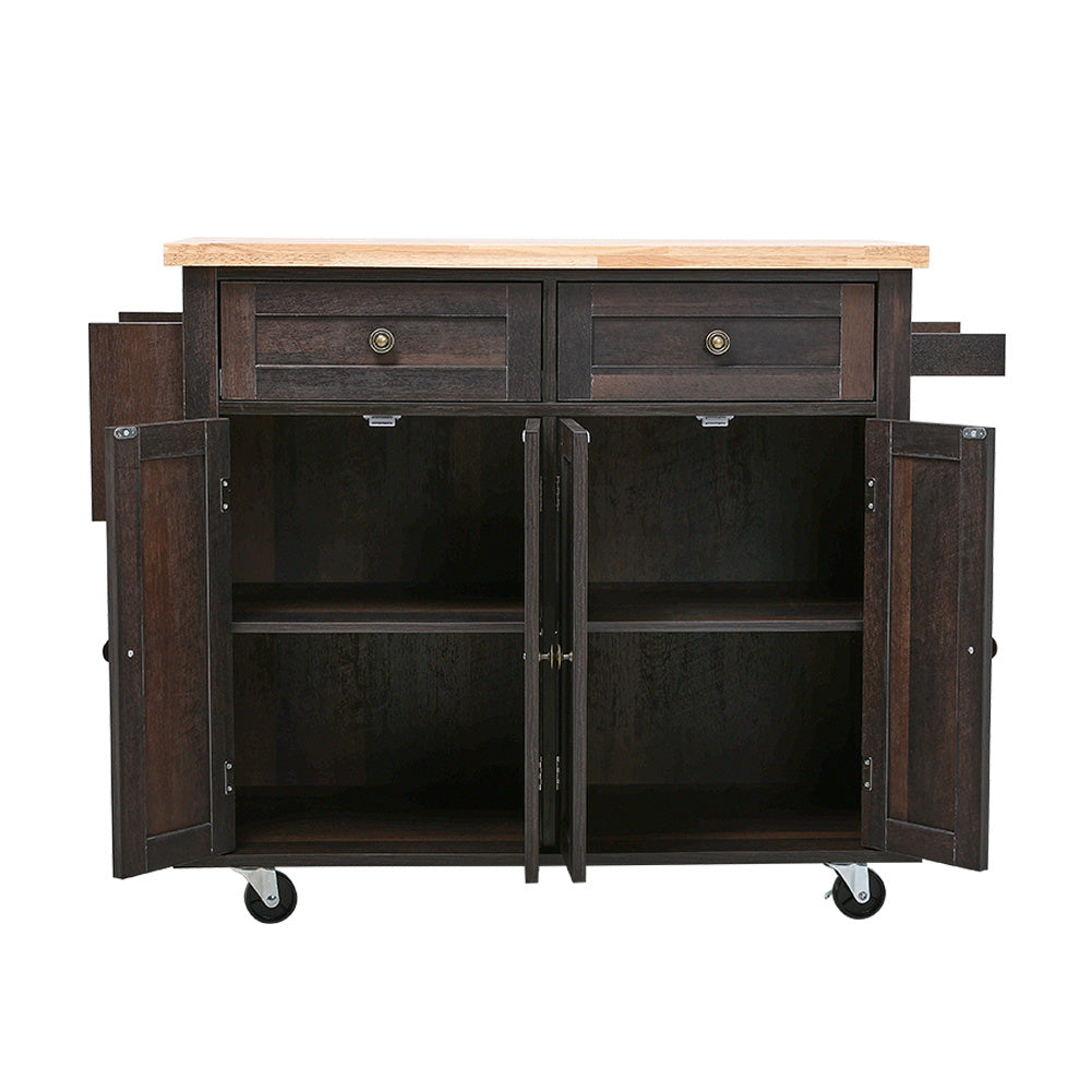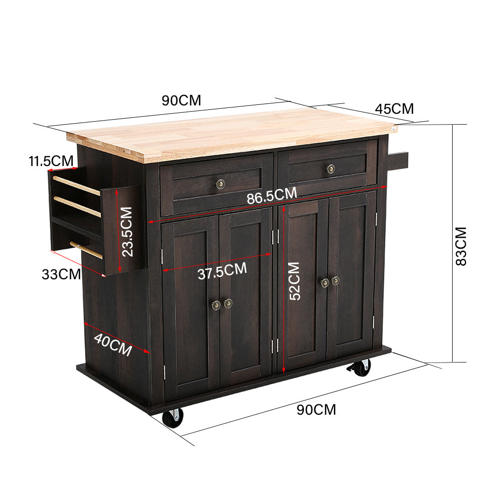 Dark brown wooden kitchen island cart measuring 83 cm in height with storage cabinets