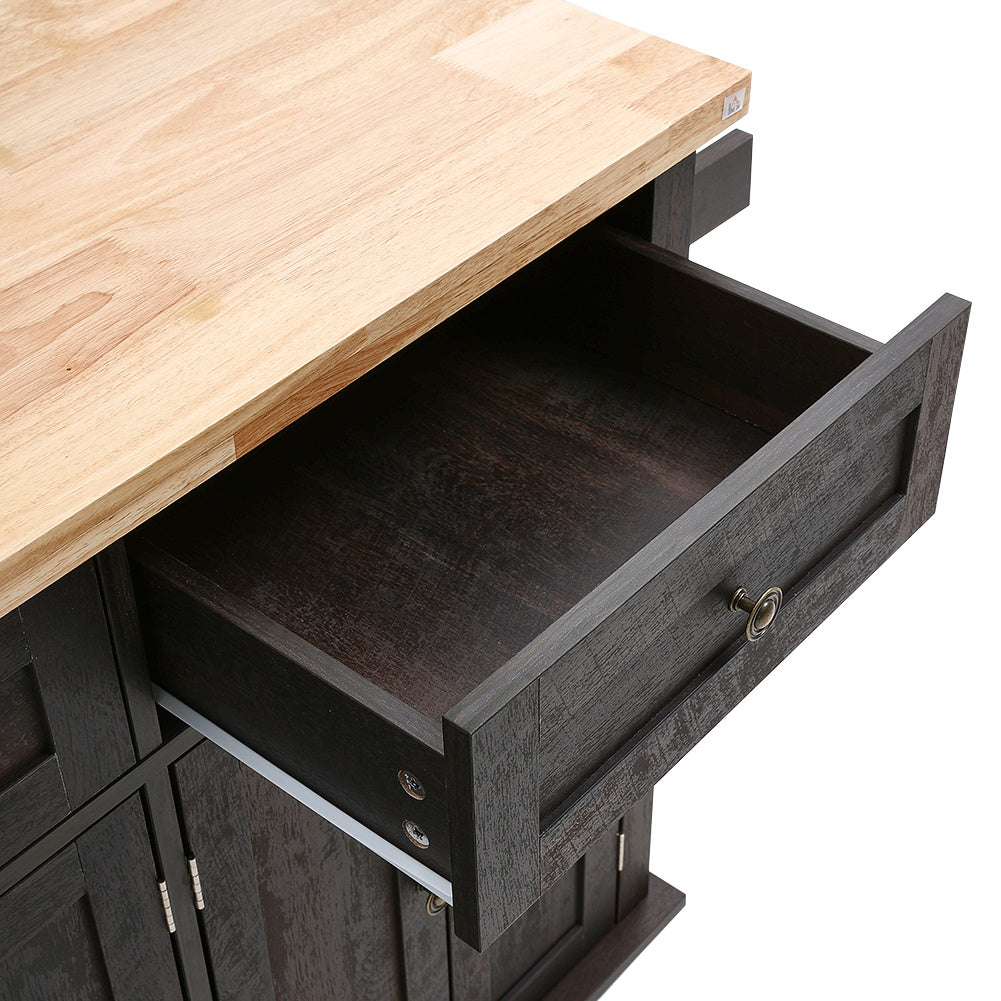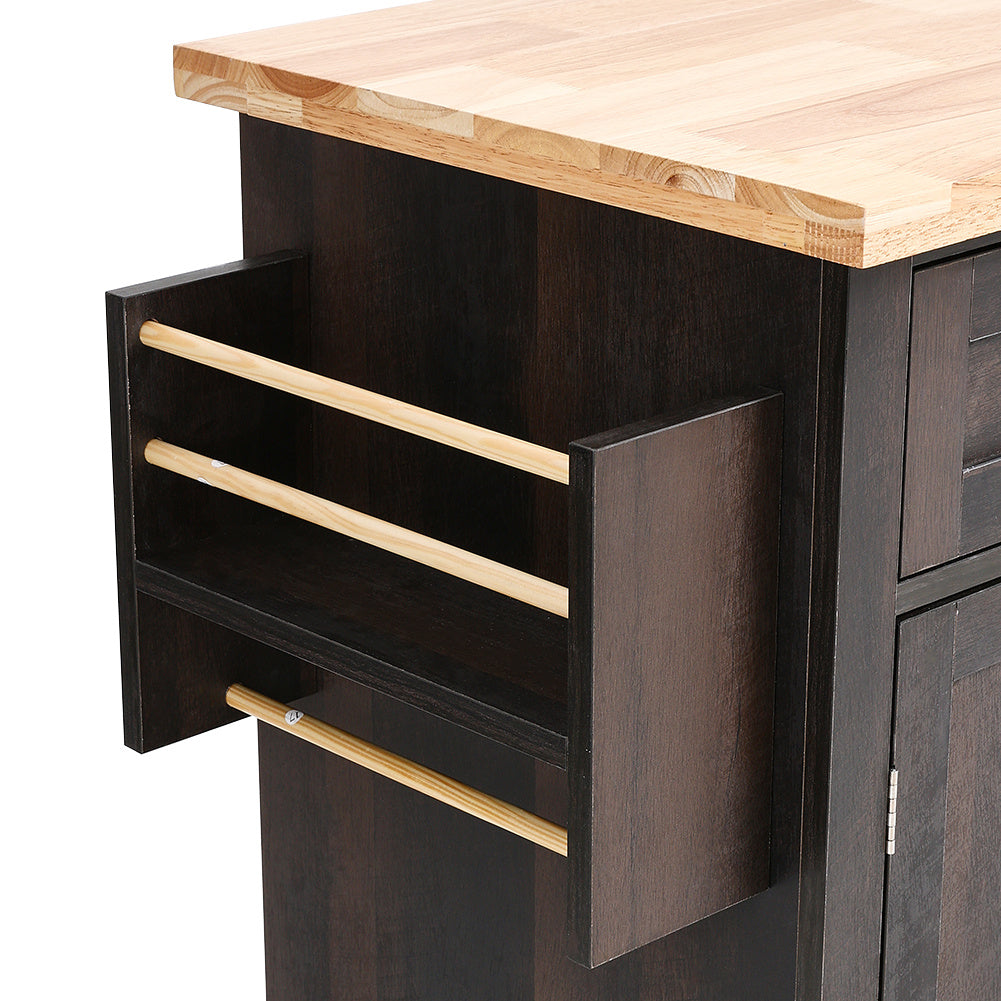 Expertly crafted from premium wood, this kitchen cart offers a sophisticated storage solution for any kitchen. Its two cabinets and two drawers provide ample space for storing appliances, while the side rack conveniently holds wine and spice bottles. The spacious tabletop is perfect for meal prep and serving guests.