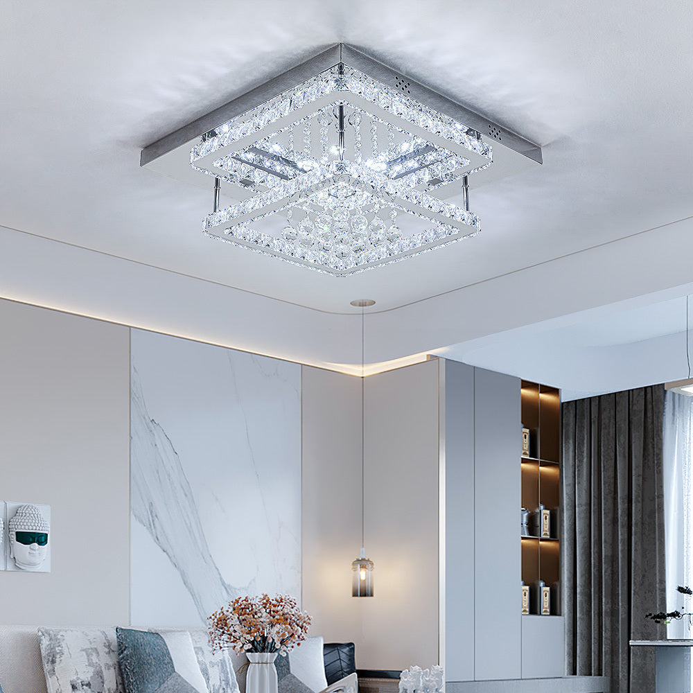 Enhance your living room with the elegant touch of this crystal ceiling light. Adorned with sparkling crystals, it catches natural light and mesmerizes with its enchanting reflections. As night falls, the fixture offers graceful illumination, casting beautiful light and shadow patterns on the ceiling and wall. Made with stainless steel, this light boasts both durability and timeless elegance, ensuring it maintains its pristine appearance after years of use. Elevate your living space with bright light and a touch of luxury.