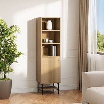 Elevate your storage game with our tall cabinet, designed to maximize vertical space without compromising on style. Featuring three levels of open shelving, a cabinet with built-in shelves, and a bottom shelf, this cabinet offers multiple storage options, making it perfect for both showcasing your collections or figures and concealing your daily necessities. Crafted from high-quality particleboard, it stands the test of time.