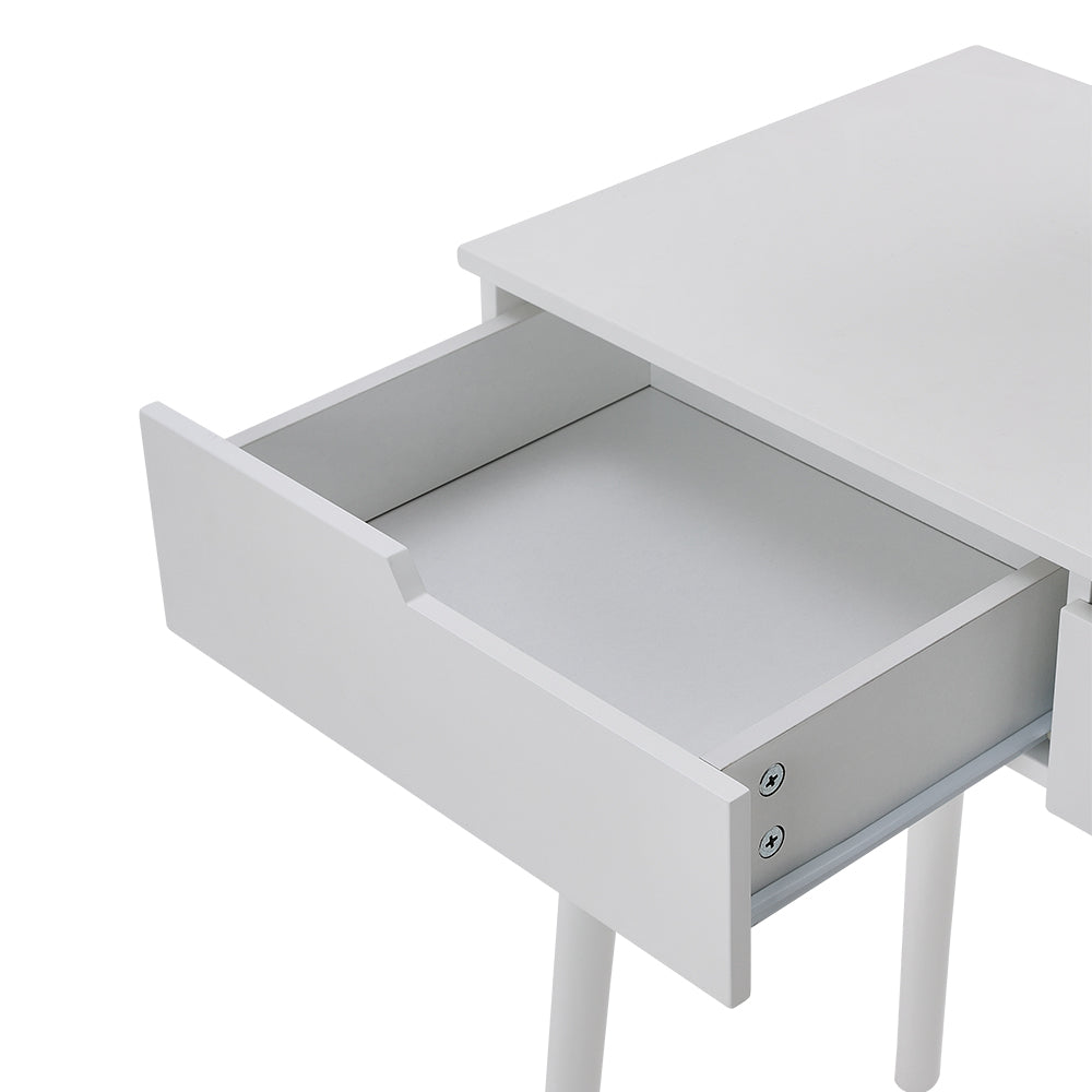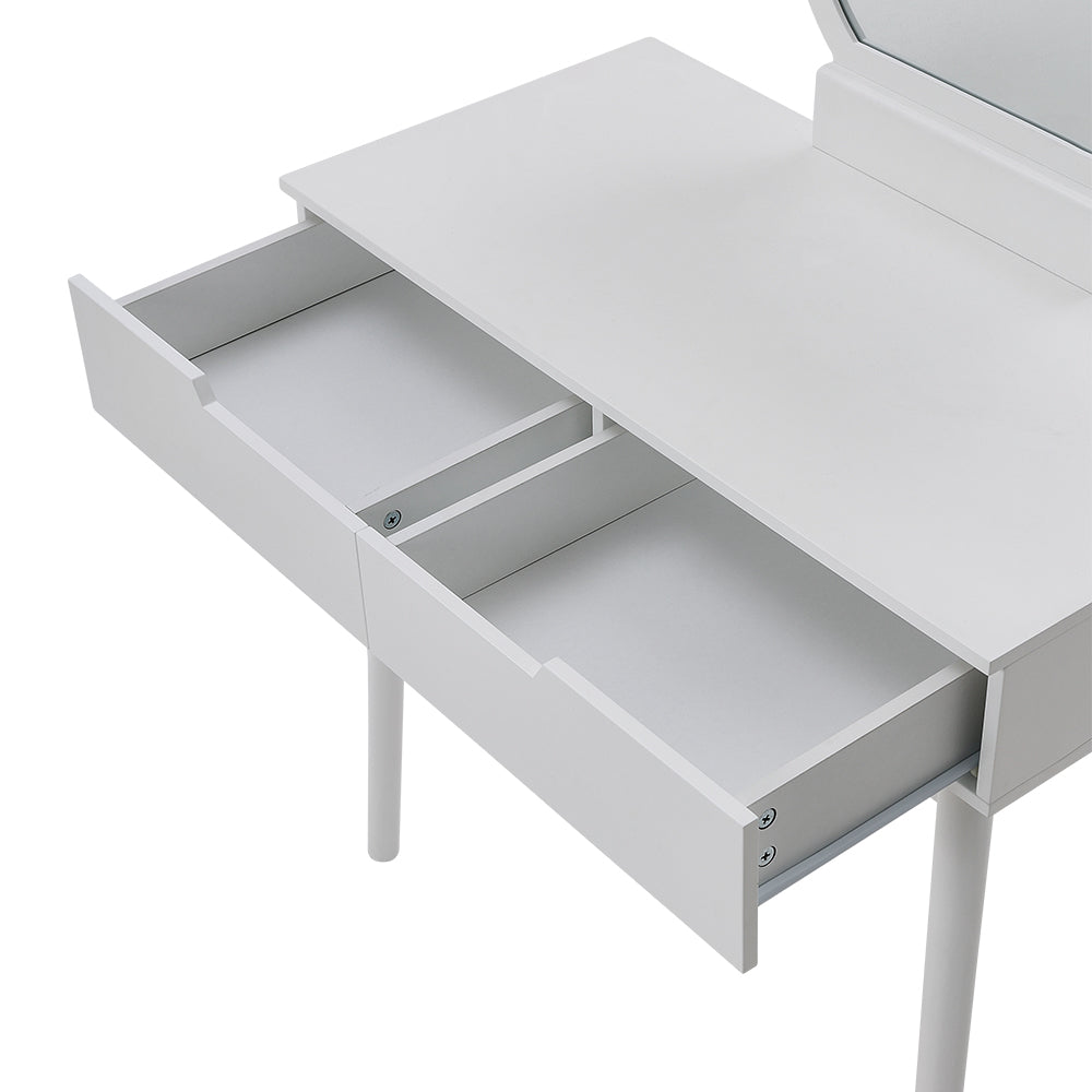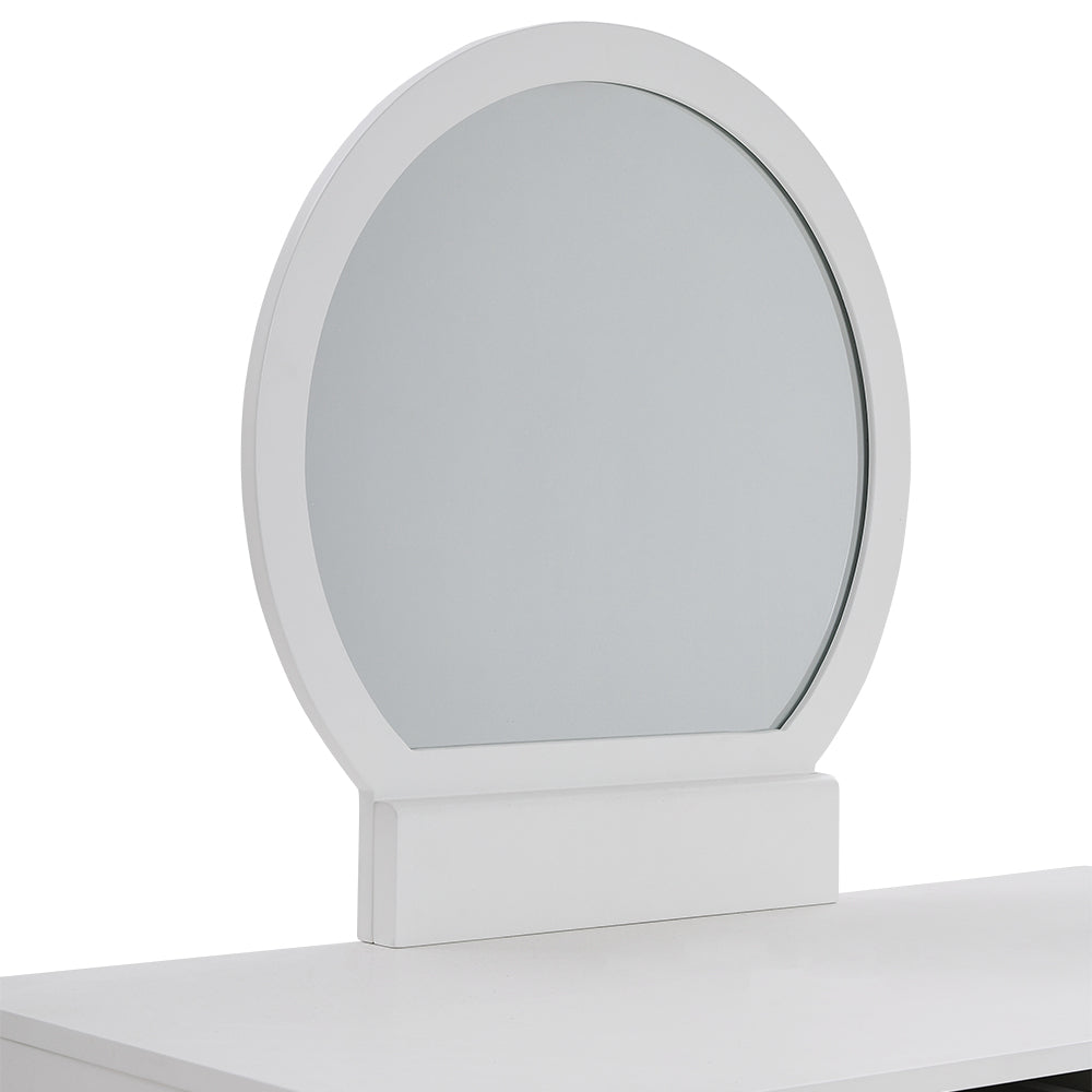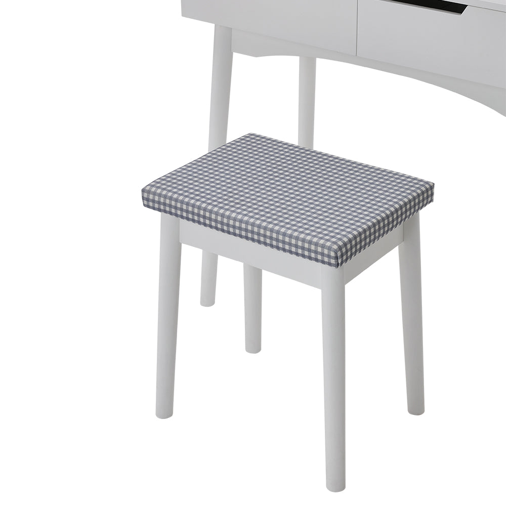 Elevate your daily routine with the White Elegant Vanity Table. This high-quality piece seamlessly integrates style and functionality, featuring two large drawers for efficient storage. Complete with a chic checkered fabric stool, this vanity showcases a striking circular mirror. Constructed with E1-grade MDF and a durable paint finish, it is supported by sturdy pinewood legs. The metal hardware has been extensively tested with salt spray for optimal strength and resilience. This vanity table is the perfect choice for a contemporary bedroom or dressing space.