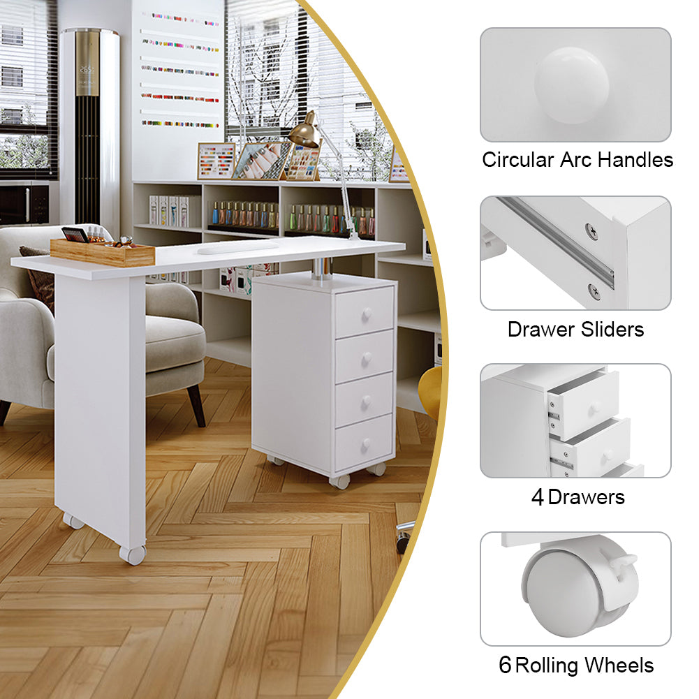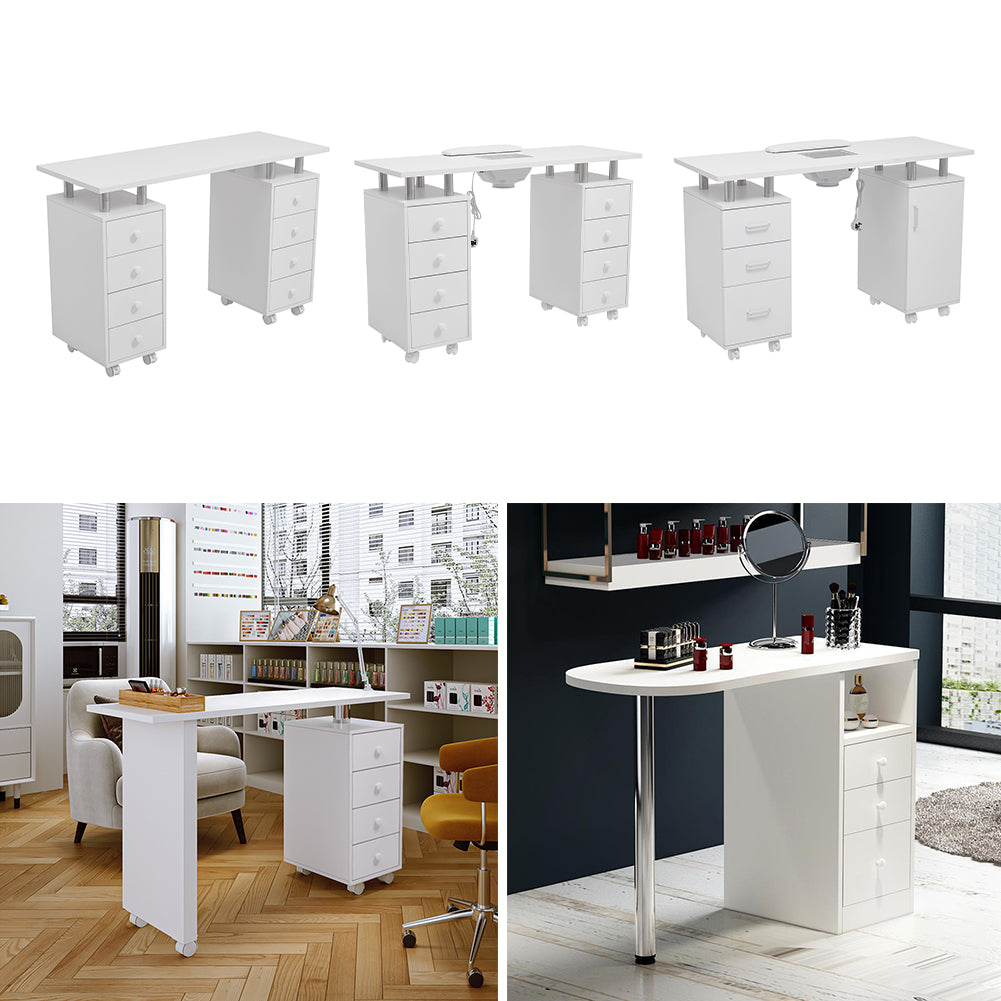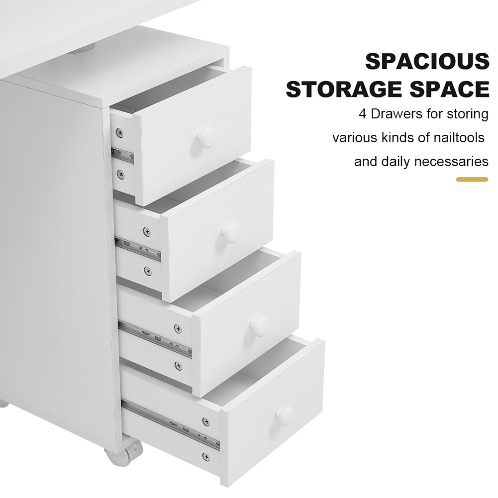 Optimize your salon with this must-have professional manicure table by Home & Outdoor Direct. With 4 pull-out drawers for easy access to your nail care essentials and a spacious tabletop for a comfortable experience, this table is designed with quality and functionality in mind. Plus, its durable high-density wood board and attached wheels make it easy to move around.