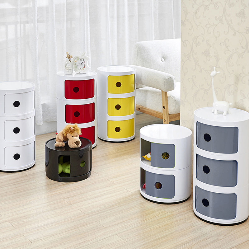Maximize your space and eliminate clutter with the Cylindrical Multi-Tiered Plastic Storage Drawer Unit. This expertly-designed unit utilizes compact space through its tiered structure, providing organized and hidden storage. The top tier can also been uesd as a tray for items like cups and books, while the unit itself adds a touch of charm to any room with its vibrant color options. Experience the ease and functionality of this impressive storage solution.