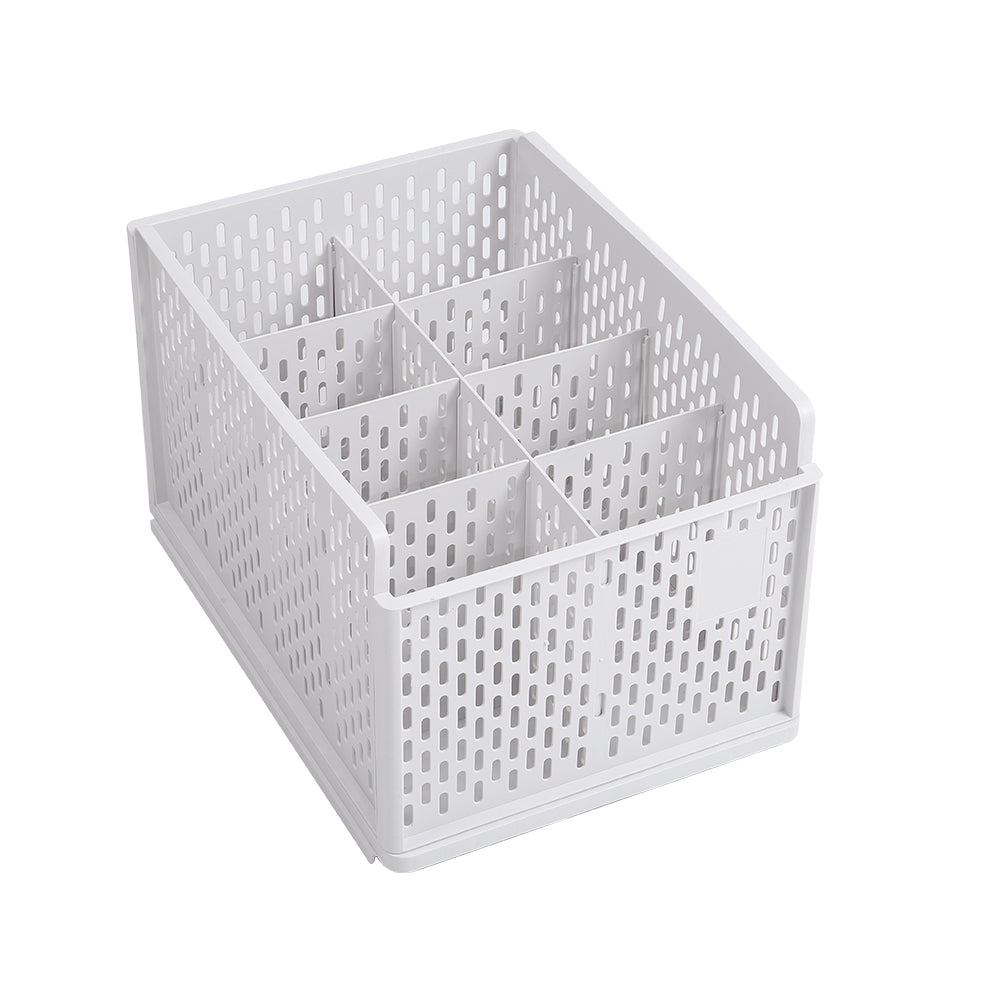 Efficiently organize your trousers with this stackable storage basket. Featuring eight compartments and a wide opening design, this basket allows for easy viewing and access to your items. Made of durable, lightweight plastic, it fits perfectly in most standard-sized shelves and cabinets, saving space and creating a customizable organization system.