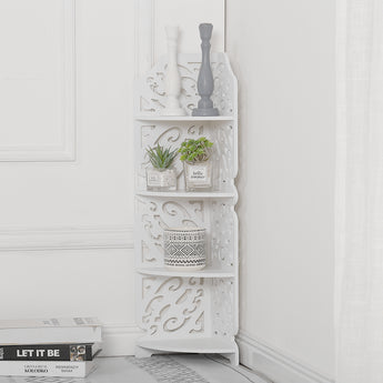 With its muted white finish, elegant silhouette, and refined carved patterns, this corner display stand is truly unexpected. Despite its compact size, the shelf can beautifully showcase all of your favorite potted plants. The 4-tier open shelves provide ample space for tending to your greenery. Each panel is intricately carved, showcasing subtle yet expressive details that add a touch of understated elegance to any interior.