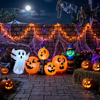 Get ready to enhance your "Trick or Treat" party this Halloween! Our Halloween inflatable decorations set combines classic elements like ghost, pumpkins, skeleton, and witch to create a scene that is both mysterious and joyous. Each character is vividly coloured and features playful expressions, bringing out the festive spirit. With multiple built-in LED lights, the entire scene comes alive at night, making your setup remarkably eye-catching. These inflatables transform your space into a festive celebration, perfect for decorating your yard or setting up a haunted house. Bring home these unique additions and make your Halloween unforgettable!
