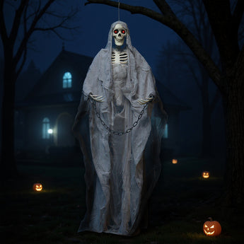 This 171cm tall skeleton ghost is a classic Halloween element that will never out of date. The skull is wearing tattered clothes and its hands are chained. He watches you silently in the darkness. When someone gets close, the skull's eyes will glow red and make a terrifying sound, making you shudder. This decoration prop can be used not only for Halloween, but also for any occasion that requires a spooky atmosphere.