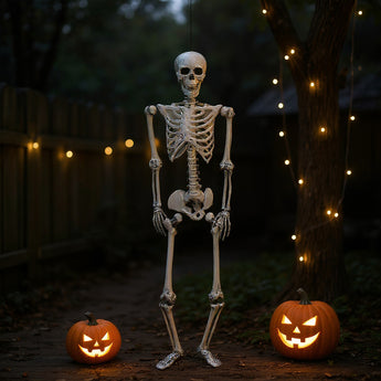 Instantly create an eerie haunted house ambiance with this handsomely made skeleton. Featuring a slender look, this full-body skeleton stands tall in a distressed white finish to make for a striking festive decoration. The joints of this skeleton can be positioned freely, in this way you can have the skeleton the way you want it. Constructed from selected plastic, it allows for outdoor and repeated use. A remarkable addition for Halloween and other horror-themed events to complement your flawless decorating scheme.
