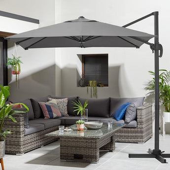 Expertly designed, our Outdoor Cantilever Parasol in Grey with Base is more than just a practical solution to the hot sun. With an expansive 2.5 metres of shade, it's perfect for sheltering outdoor furniture, letting you enjoy the warm weather all day long. And with an easy-to-use wind-up crank function, opening and closing it requires little effort. Please note to keep it closed during harsh weather.