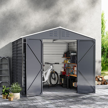 Maximize your gardening efficiency with this high-quality charcoal steel tool shed. The shed features two front windows, allowing natural light to flood the interior, creating a welcoming and functional workspace. The strategically placed vents ensure proper air circulation, preventing condensation and maintaining an optimal environment for your tools and supplies. With built-in shelves, you can keep your gardening essentials organized and easily accessible. This spacious shed offers ample room for storing larger equipment, pots, bags of soil, and more.