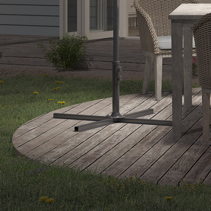 This metal parasol cross base is ideal for adding sturdiness to your parasol. Its cross structure guarantees reliability and can easily be moved and assembled. Made of high-quality materials, it will maintain its condition even after years of use. We recommend adding an extra 50kg weight after assembly for added reinforcement. Perfect for homes, diners, and cafes, this is the perfect parasol base.