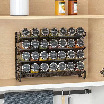 This spice rack organizer is a space saving essential for your kitchen, pantry or cabinets. It features 4 shelves that can accommodate all your spices and condiments in one place. Made of strong iron and treated with powder coating electrostatic spray, it is extremely sturdy and durable. The inclined shelf design makes it easy to locate and quickly grab what you need.
