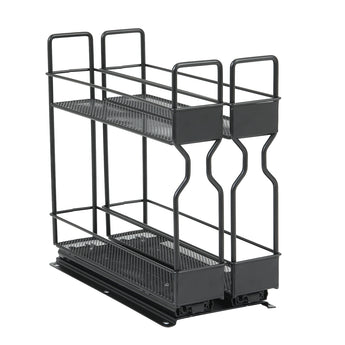 Tired of searching through cluttered spice cabinets? Upgrade your kitchen with this slide-out spice rack. This unique spice rack organizer features a 2-tier dual drawer design and glides on a metal ball-bearing slide, allowing effortlessly in and out of your cabinet. The neutral black finish blends well with various kitchen styles. Quick installation with the included self-tapping screws.