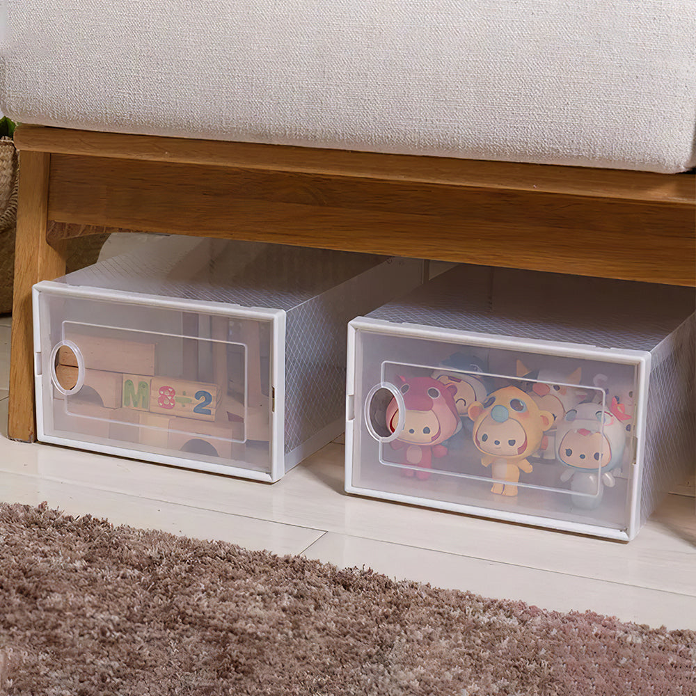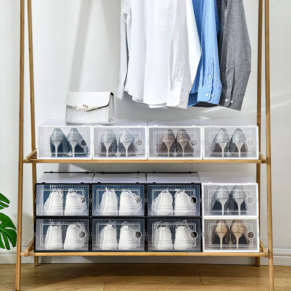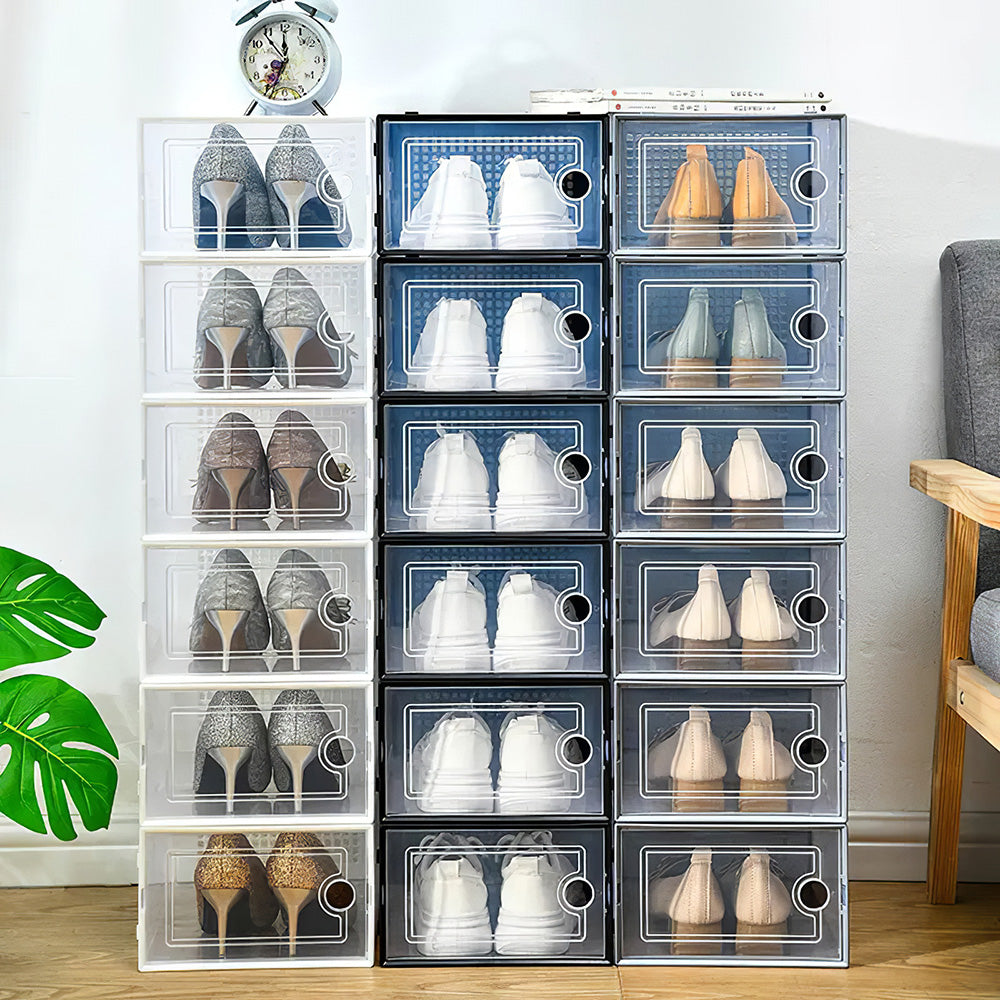 This shoe box set is ideal for organizing your shoe collection. It comes with twelve durable and transparent plastic boxes, each capable of holding one pair of shoes. The foldable design allows for easy storage when not in use, while providing dust and damage protection. Plus, the boxes can be stacked in any formation to suit your organizational needs.