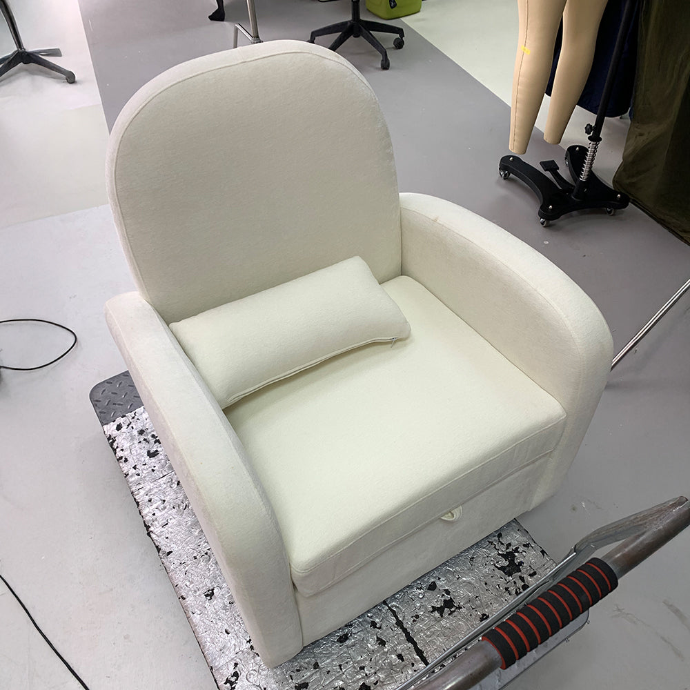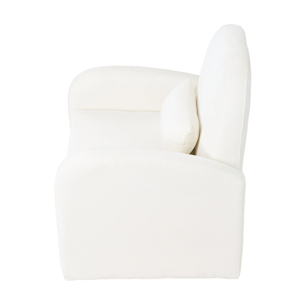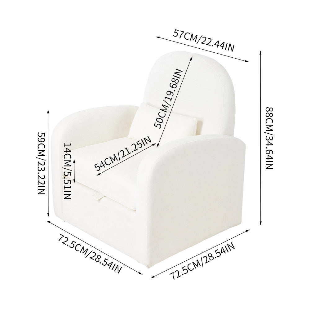 This single-seater sofa showcases a gentle beige tone, exuding a warm and cosy ambiance. Made from chenille fabric, it offers a soft touch, while the internal padding of sponge provides additional support, ensuring long-lasting relaxation. The 110° reclining backrest design adheres to ergonomic principles, allowing users to fully relax during their rest. The armrests and the included small pillow enhance extra comfort. Not only does it feature storage space beneath for convenient item storage, but it also comes with a swivel base, increasing its flexibility in use. Perfect for living rooms, bedrooms, or studies, it enhances both the look and functionality of your home.