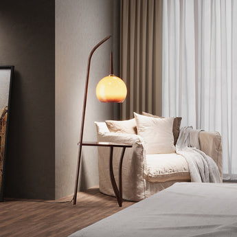 This floor lamp features a chic side table as its base, while a retro grapefruit-shaped lampshade is suspending. Blending classic charm with modern design, it adds an appealing touch to your home. The light filters through the lampshade, emitting a soft and attractive glow that creates a warm and cozy atmosphere in any room. The side table provides a spacious top for your favourite books, plants, or decorations. It will look stunning in the corner of the living room or next to a reading chair.