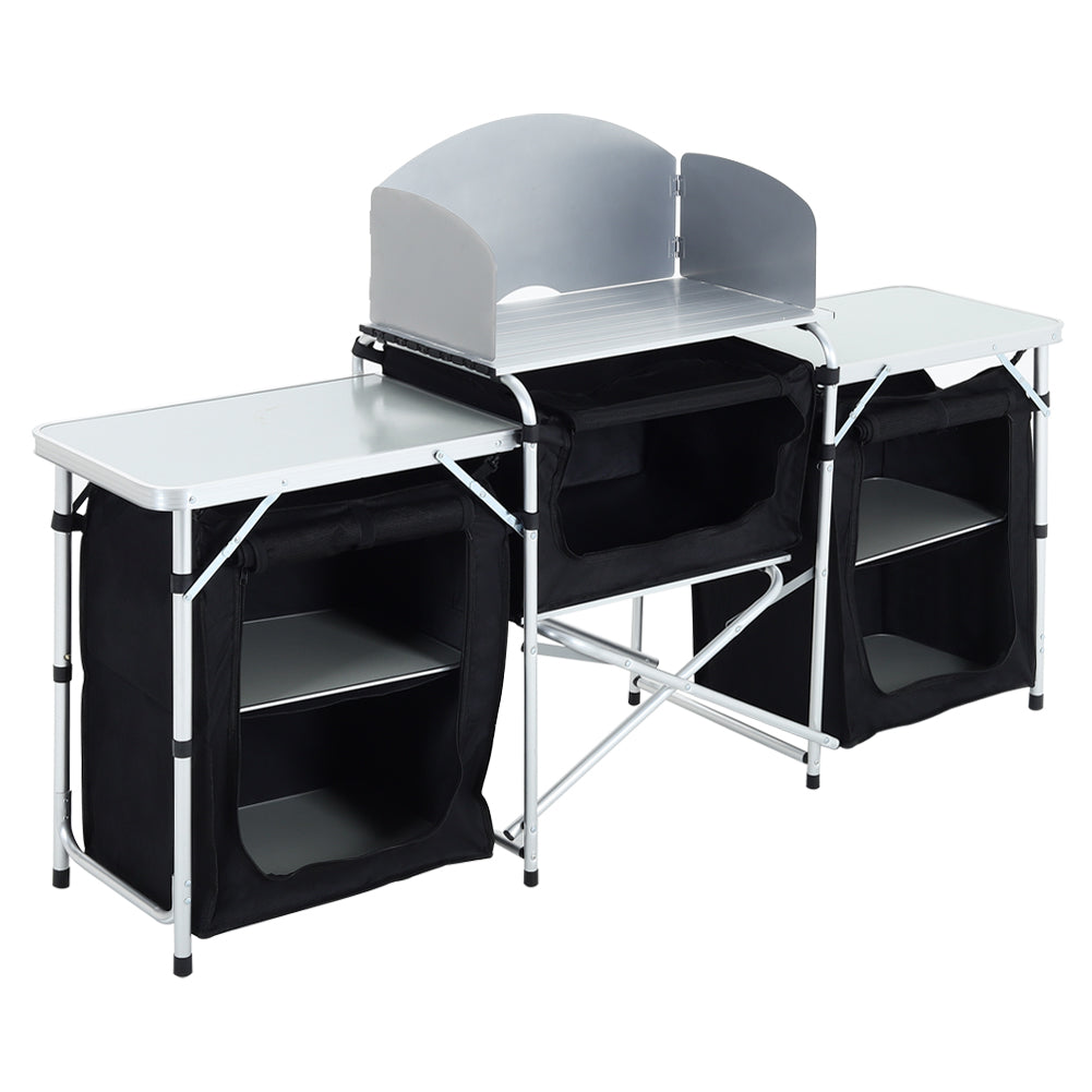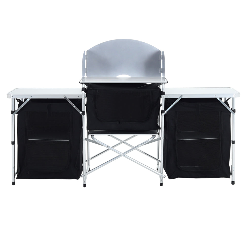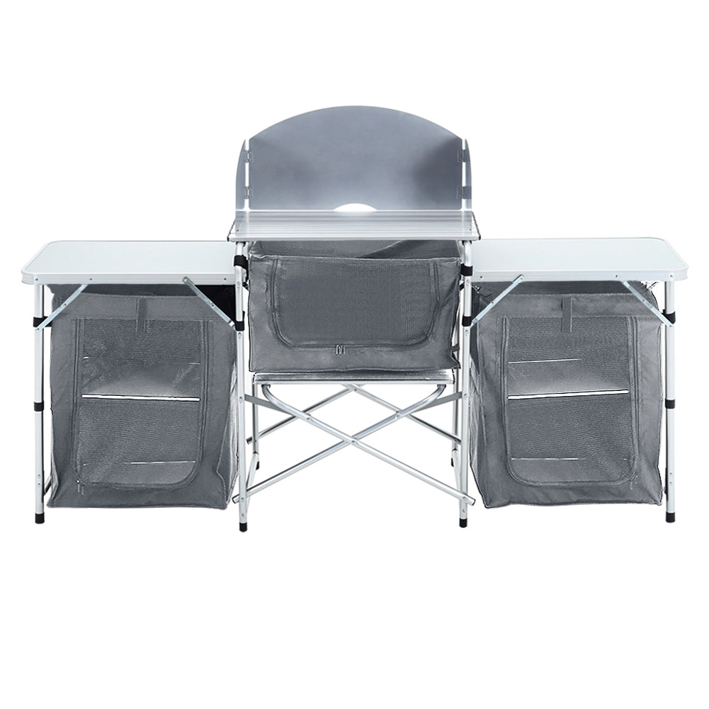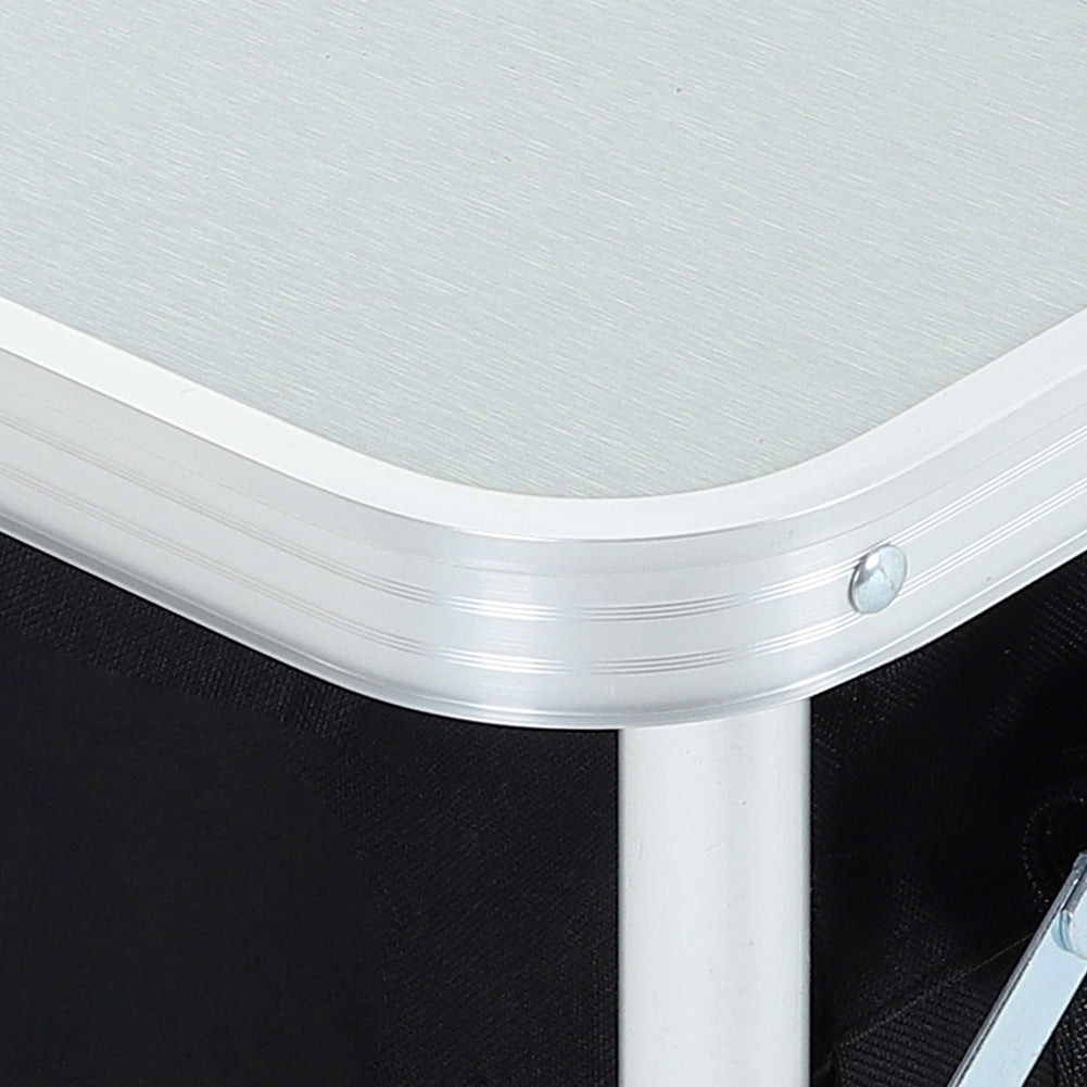 This foldable camping kitchen stand is ideal for outdoor gatherings such as barbecues, picnics, and parties. It offers a convenient way to display your cooking skills and prepare DIY food while enjoying the great outdoors. The sturdy and long-lasting design consists of a durable aluminum frame and a tabletop made of MDF. The table's rounded corners provide added safety for children, while the rubber cover on the feet prevents sliding. With ample storage space, this kitchen stand promotes cleanliness and hygiene. The bottom storage area is sealed with a zipper to ensure food safety and sanitation. Easy to assemble and compact, it can be easily transported in the back seat or trunk of your car.Features: