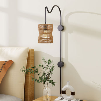 As the sun sets and night falls, illuminate your world with a touch of artisan craftsmanship and modern minimalism. This wall lamp features a hand-braided lampshade, elegantly paired with a sleek metal bracket, inviting a harmonious blend of warmth and contemporary style into your living spaces. The hourglass-shaped lampshade invites the delight of geometry, while the light emitted by the bulb passes gracefully through the braid shade, casting even illumination and decorative light patterns across the room. Whether gracing the intimacy of bedrooms, the warmth of living rooms, the transitions of corridors, or the sophistication of offices, it stands as the perfect complement, enhancing the overall ambiance and visual appeal of every corner it illuminates.